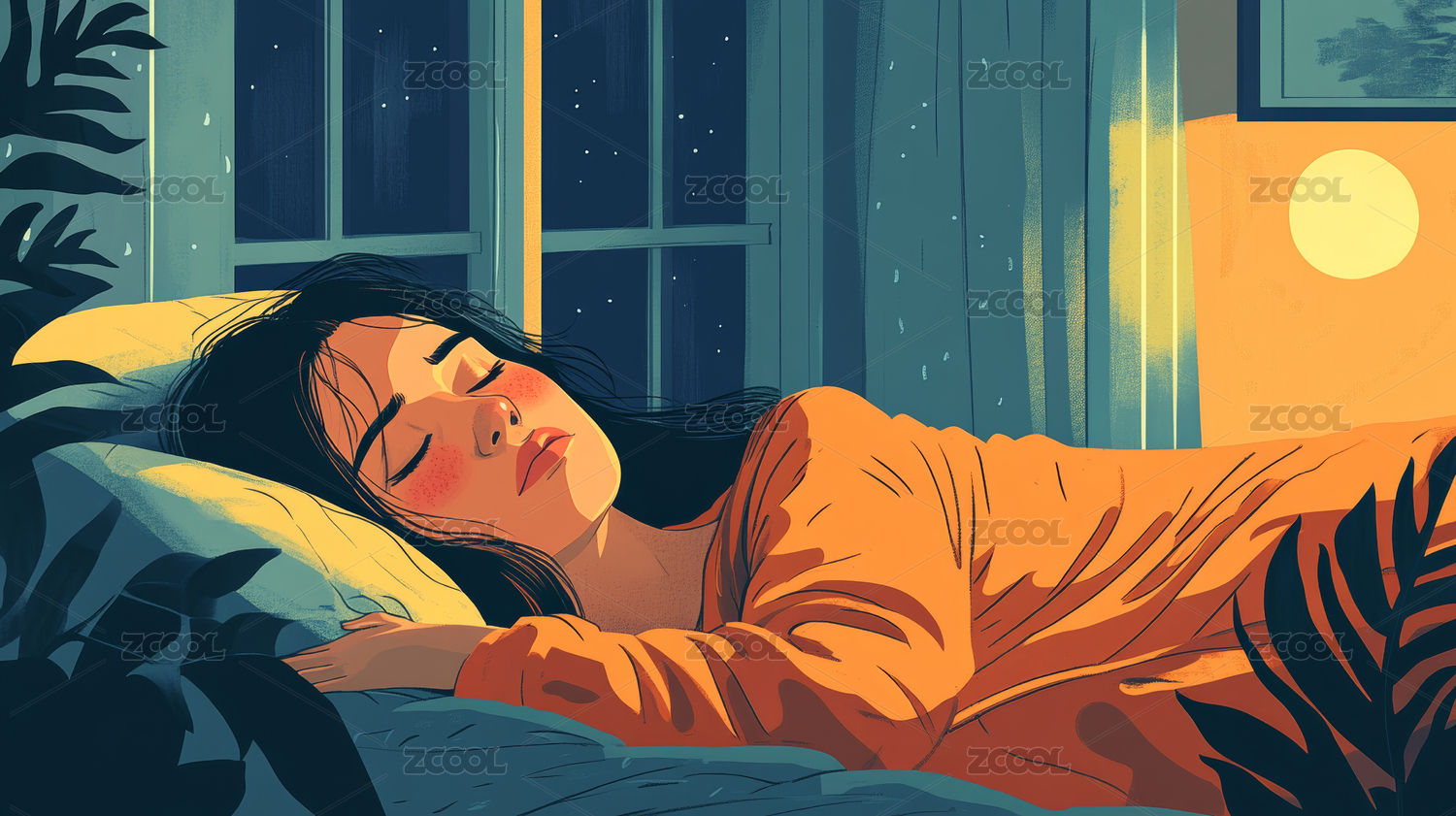 世界睡眠日年轻女孩居家睡觉放松治愈插画