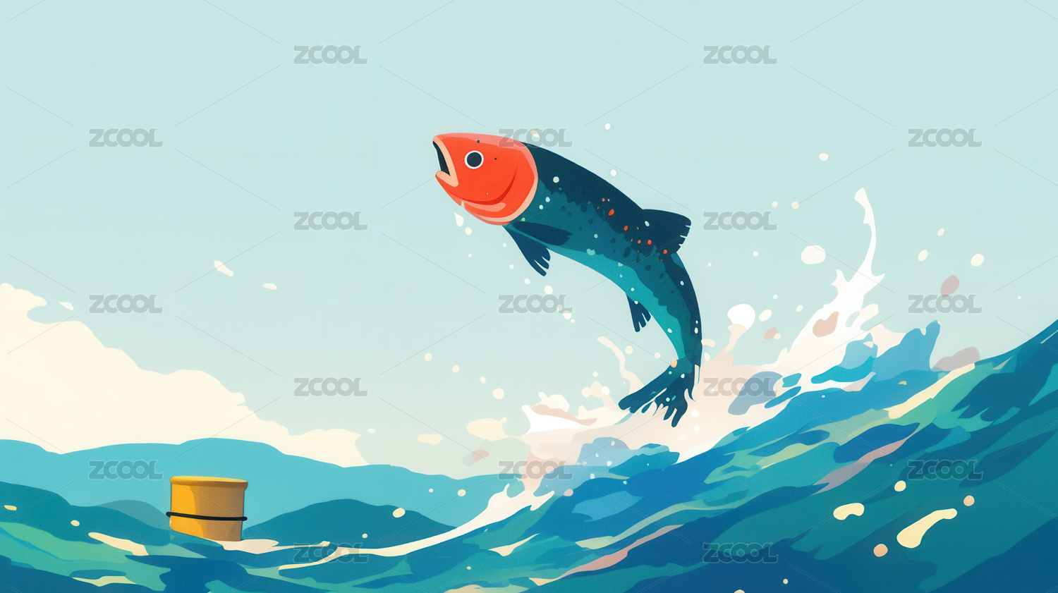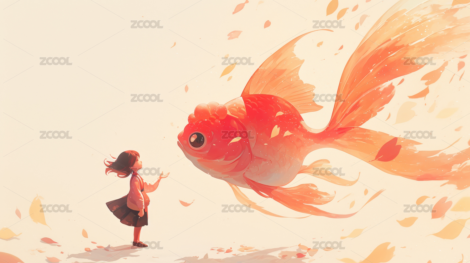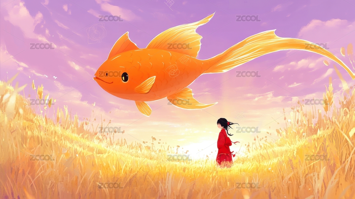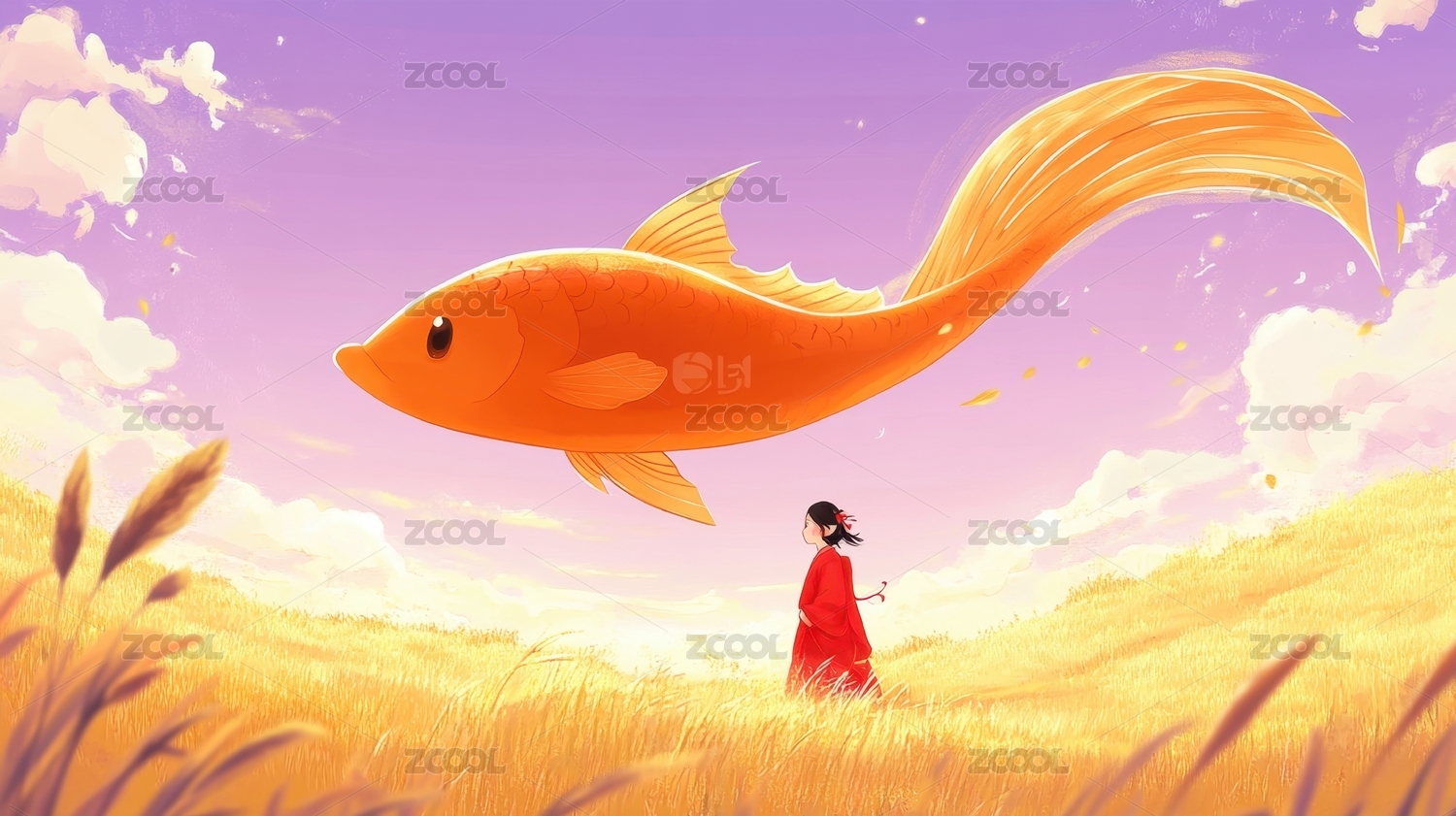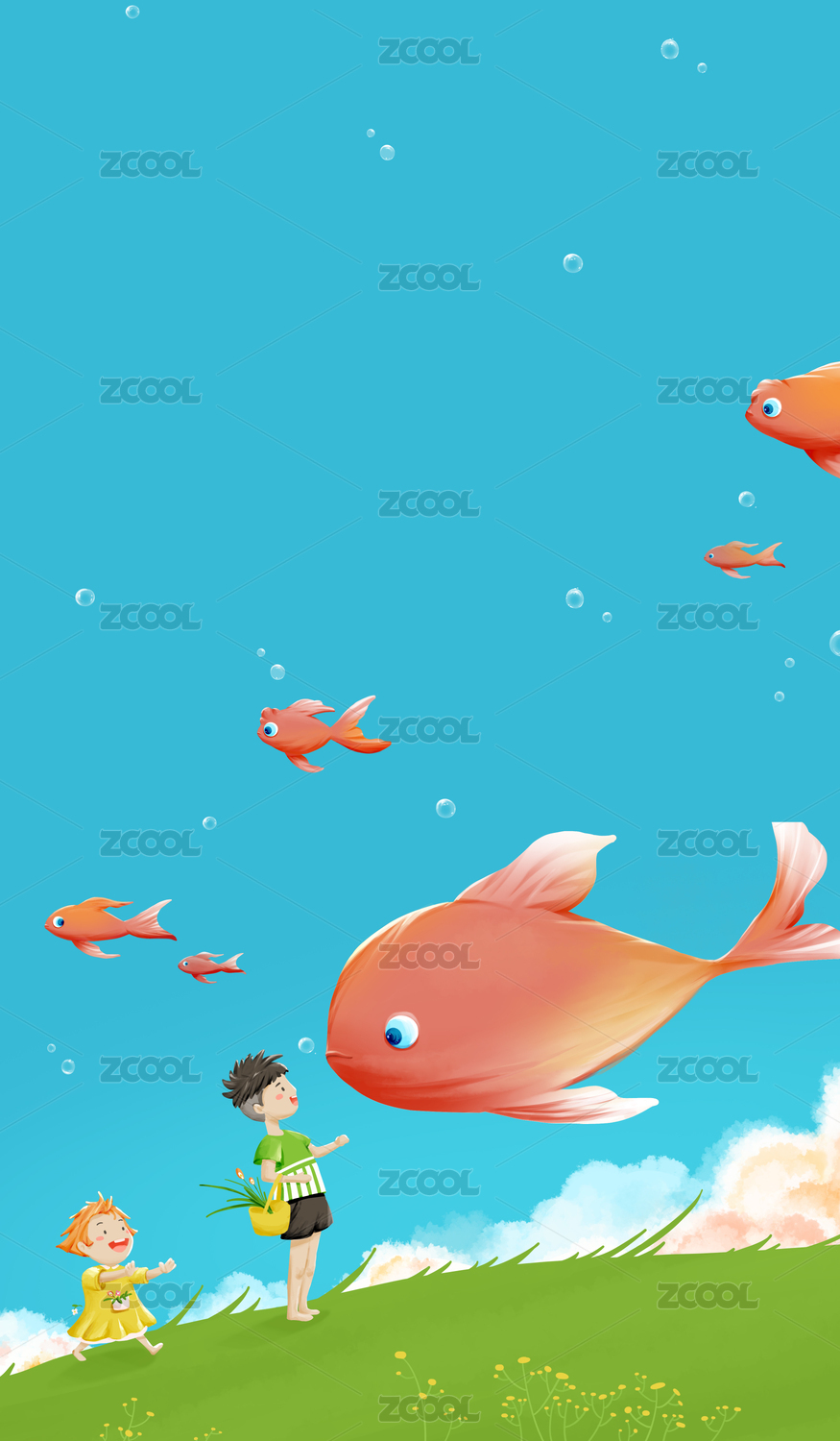 蓝天下有两个孩子和天空中的鱼插画竖版