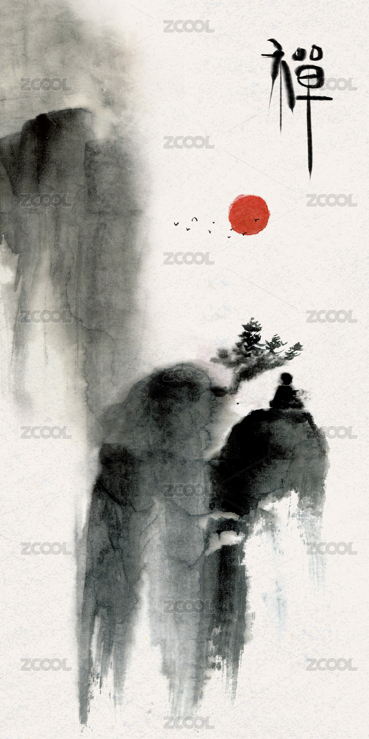 悟,水墨,山水,树,禅文化,岩石,瀑布,湖,僧人