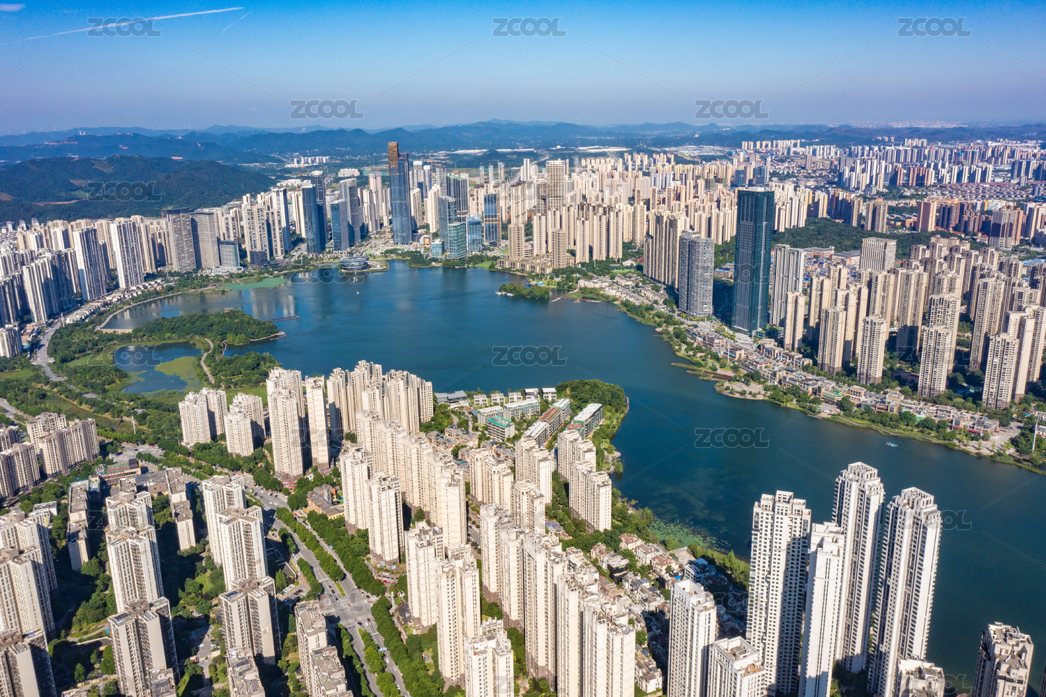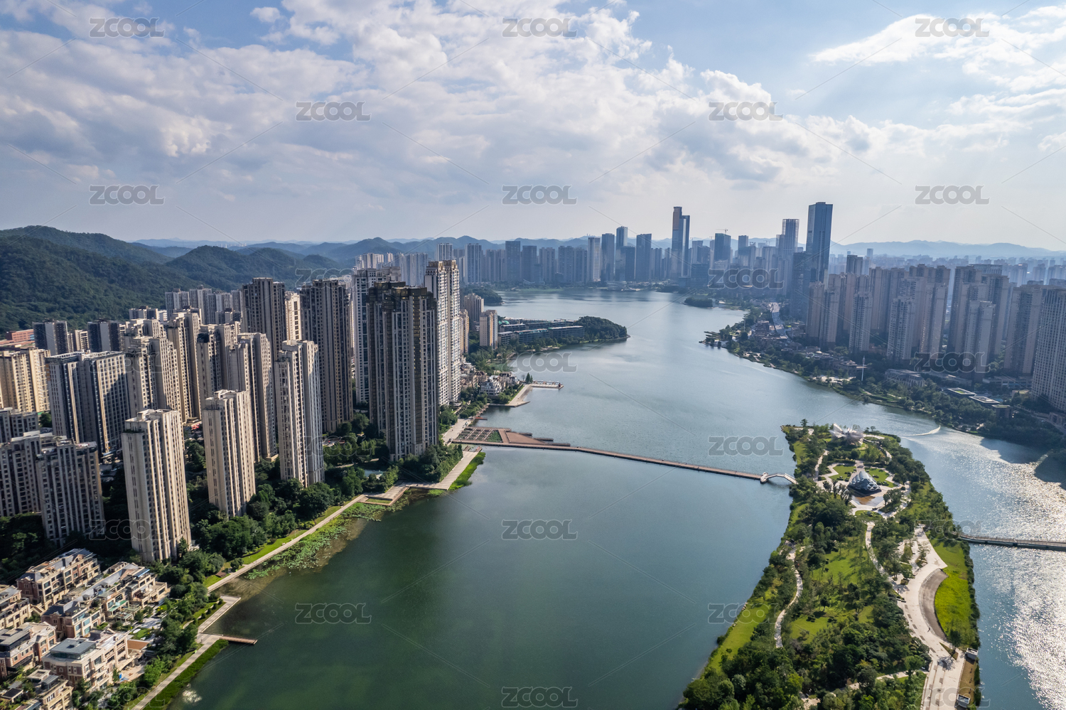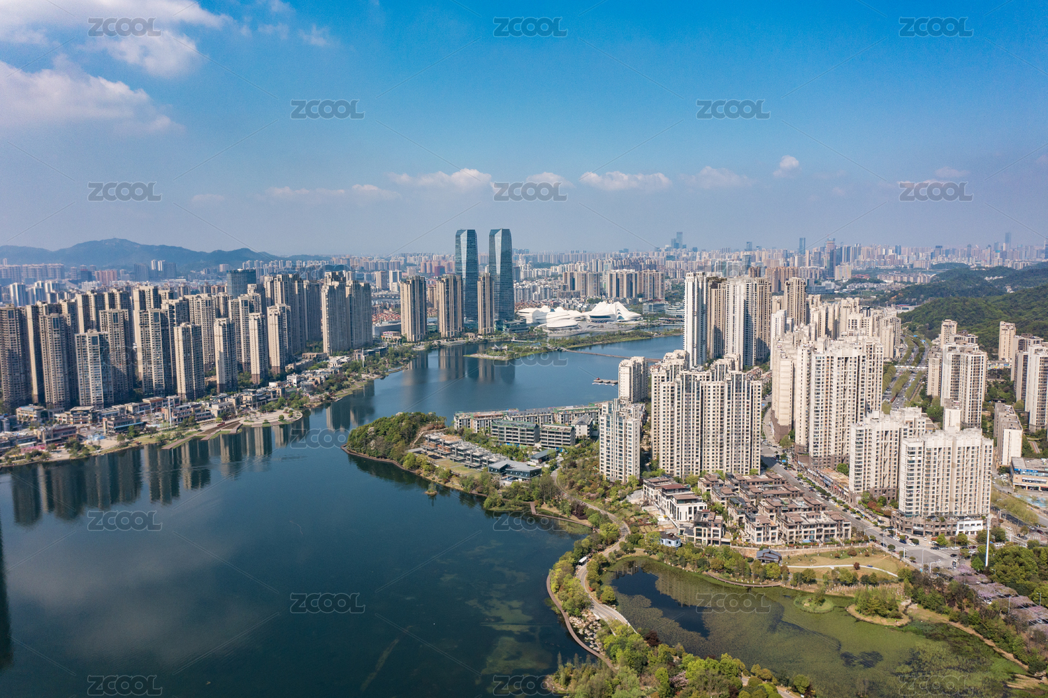 梅溪湖,长沙,城市,航拍,玻璃幕墙,高楼,房地产,梅溪湖城市岛,水面,蓝天