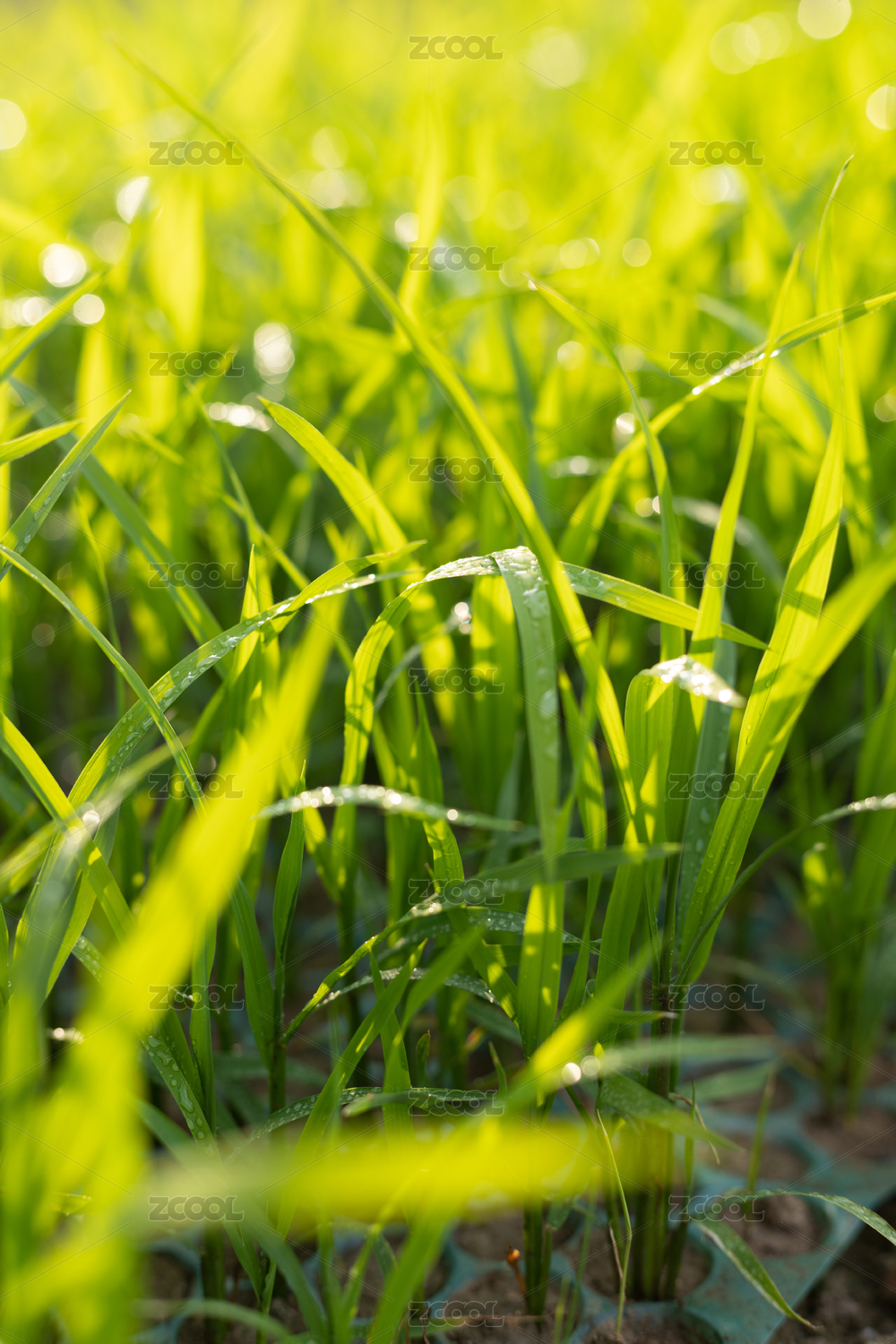 清晨阳光照耀下的稻田粘着露珠的秧苗禾苗
