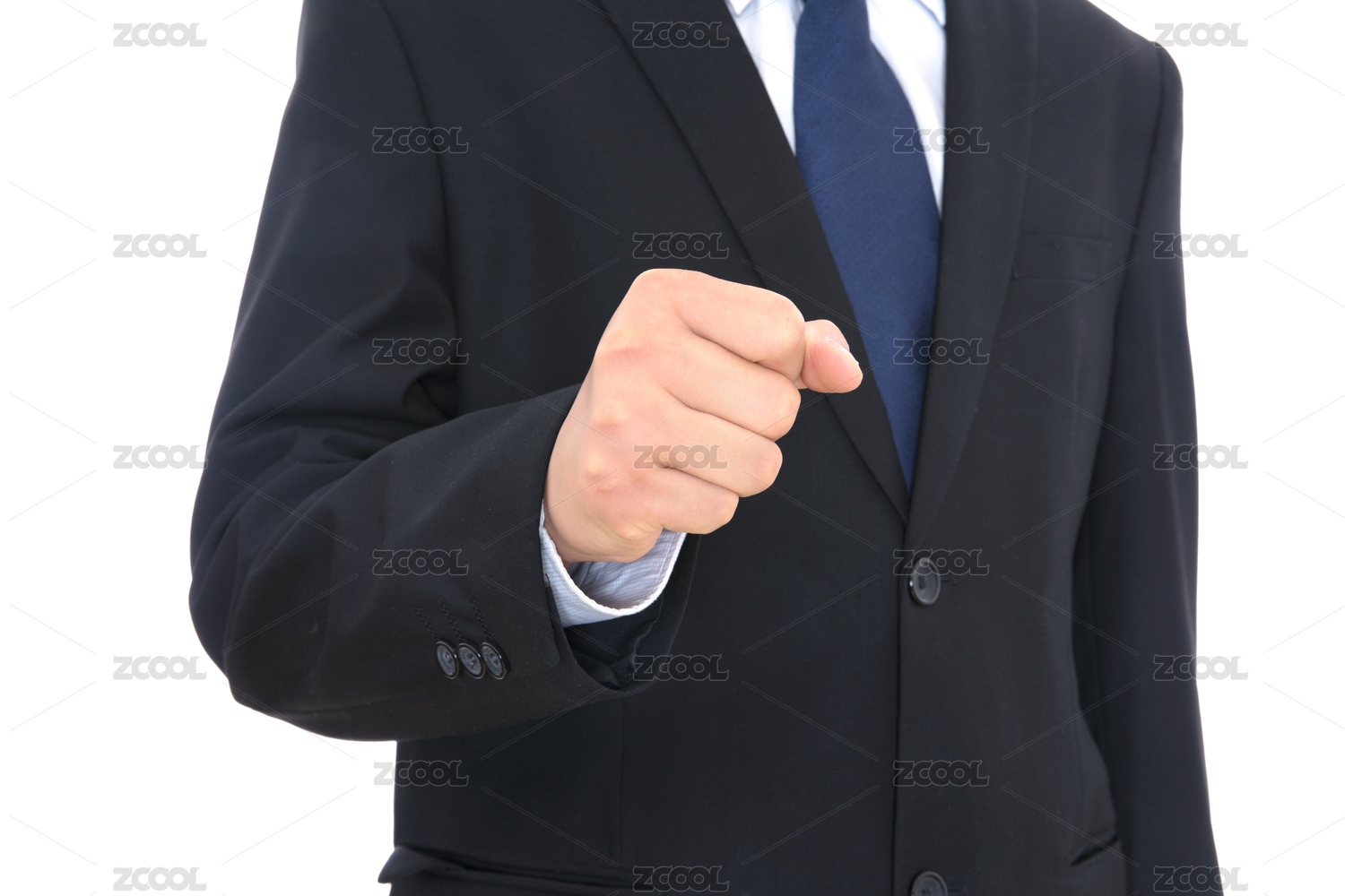 穿着黑色西装的商务男性在白背景前伸出手做出握拳的手势