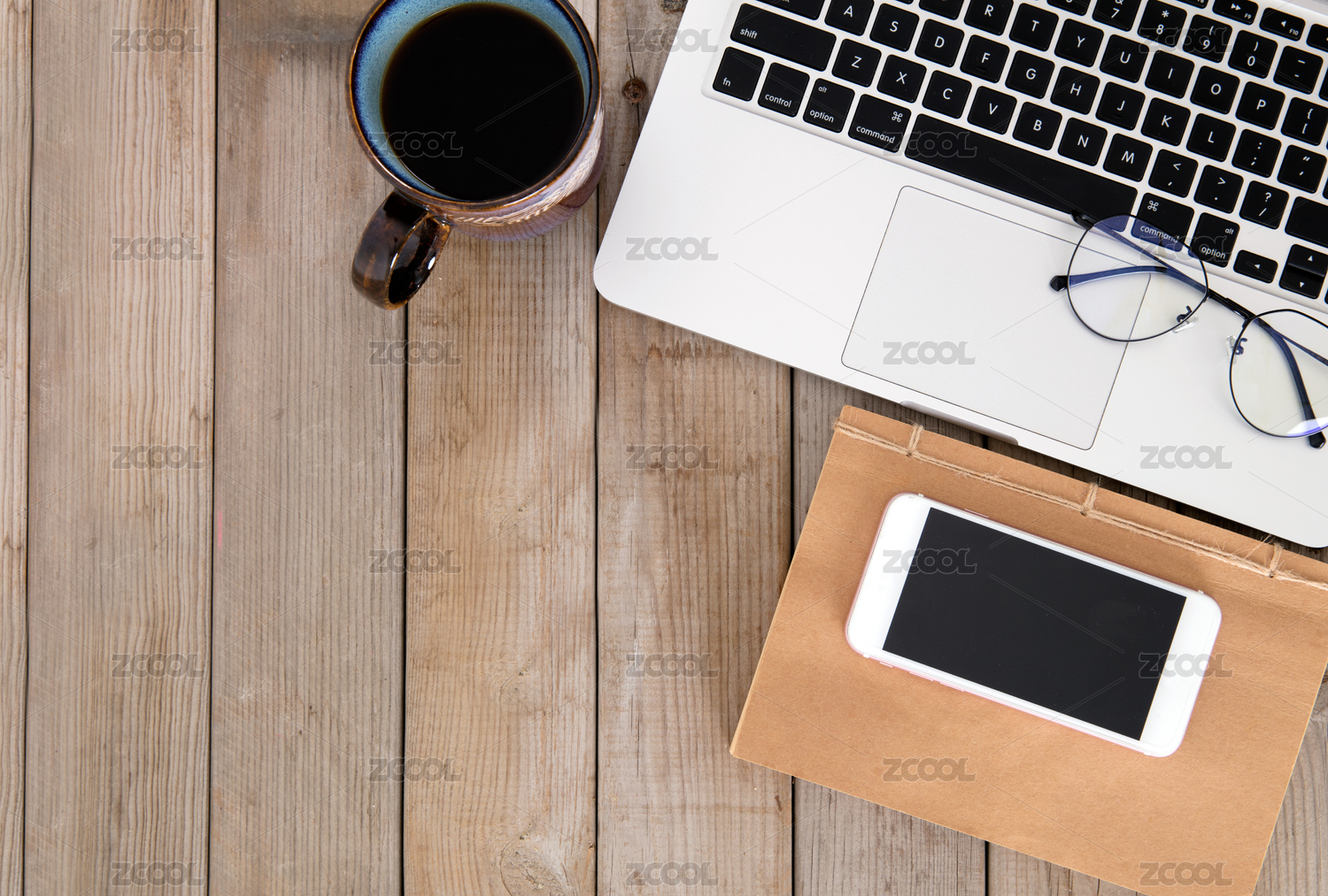 笔记本电脑手机和平板笔记本和咖啡的桌子上的杯子