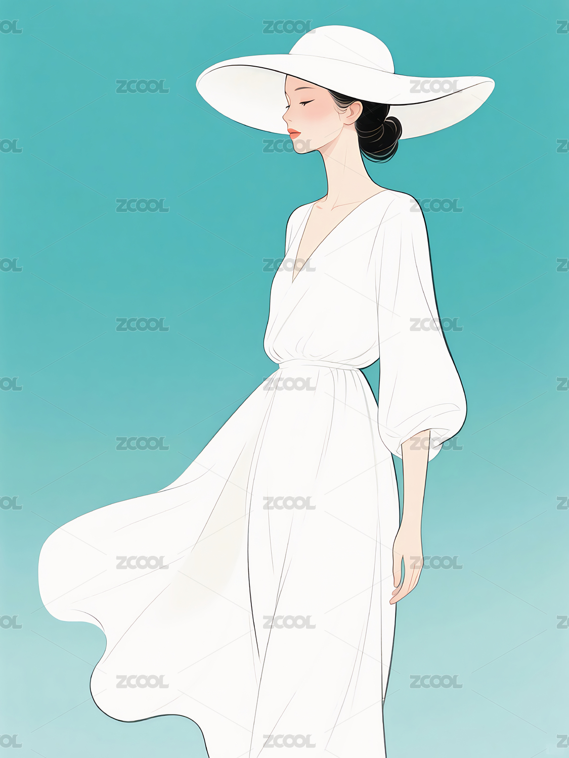 优雅女性侧影戴宽檐帽穿长裙