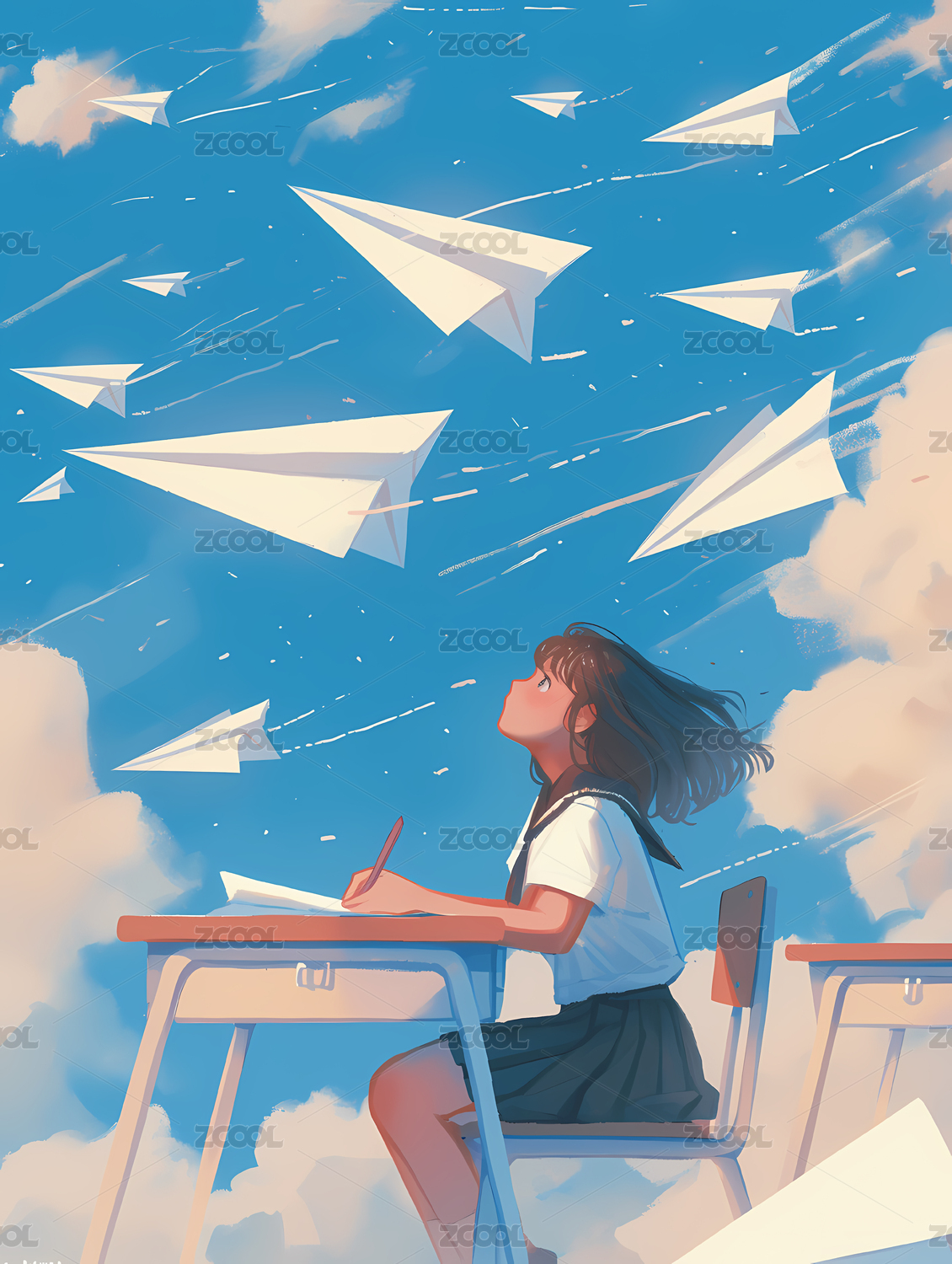 小清新仰望天空的少女板绘插图