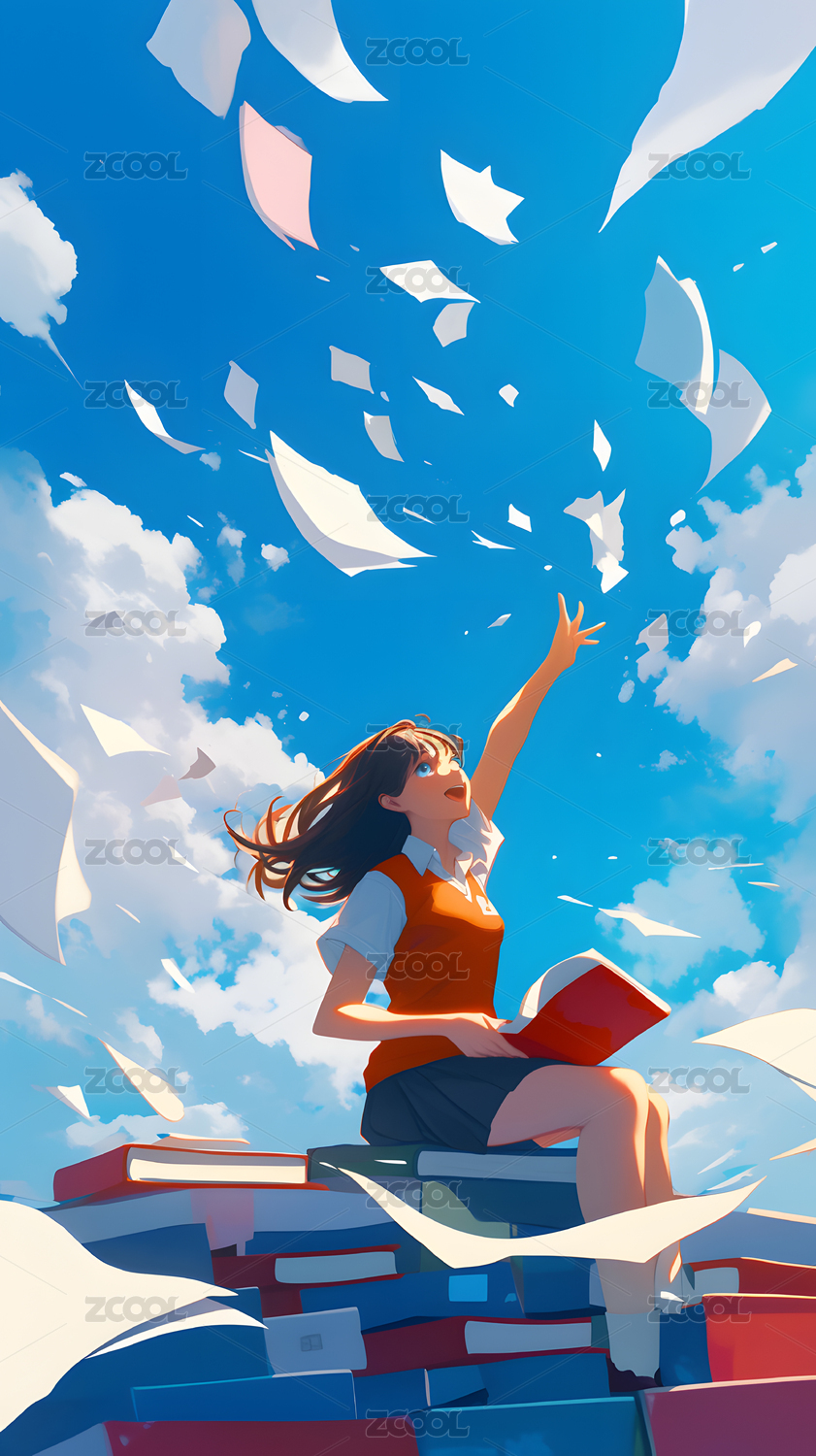 女孩坐在书本上飞上天空