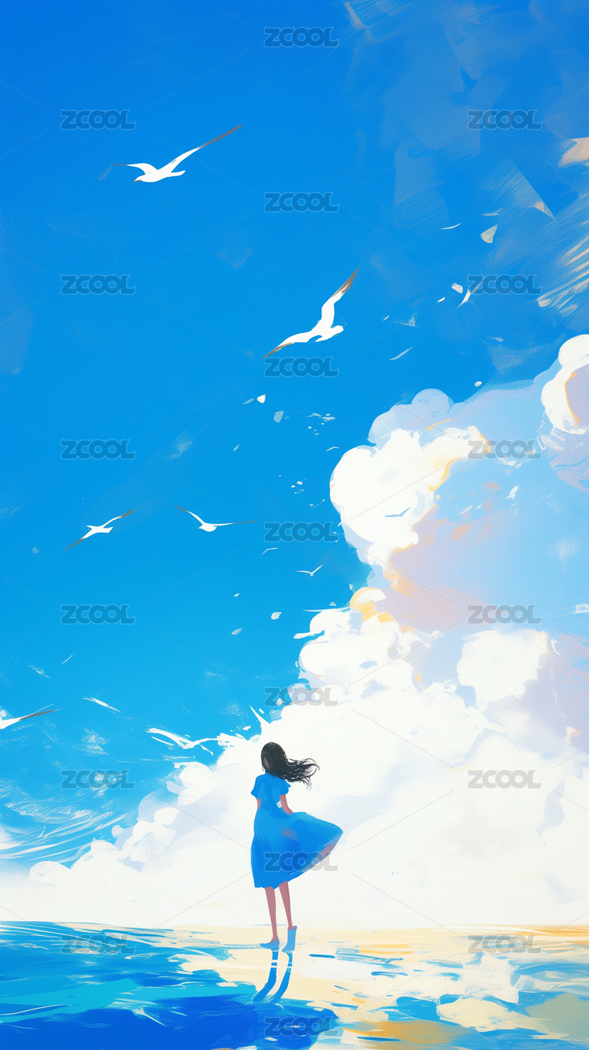 蓝天白云少女沙滩画画