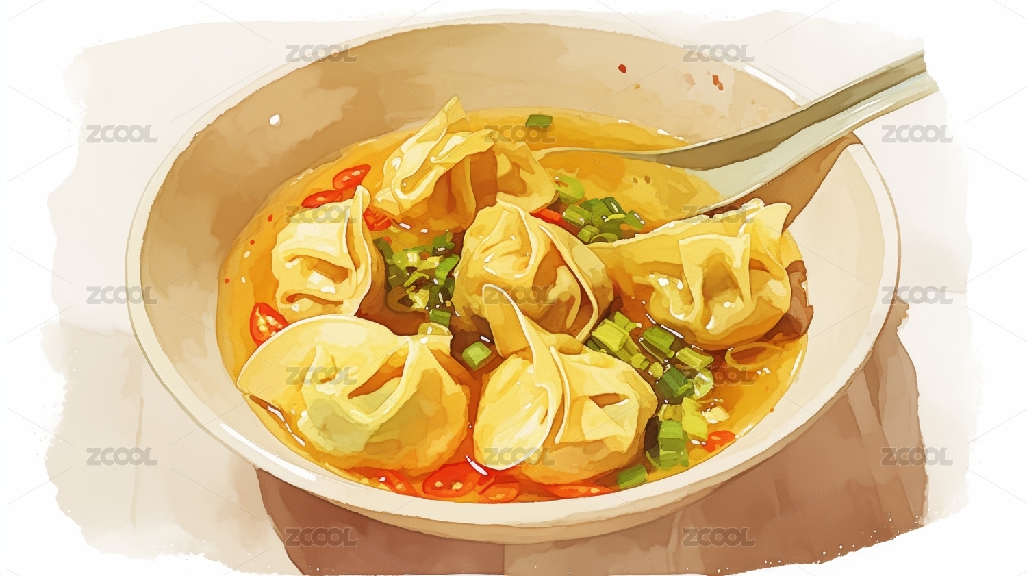 蓝色水彩写实冬至汤圆一盘水饺饺子和一叠