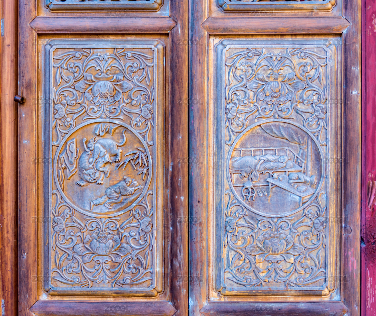 中国浙江绍兴嵊州城隍庙的木雕窗户特写