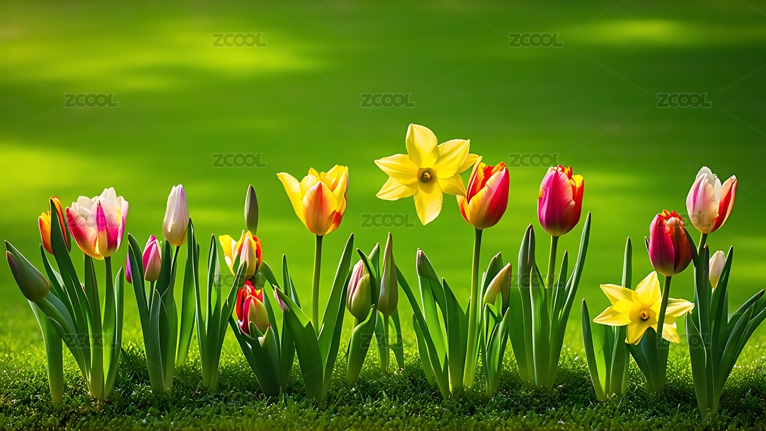 阳光下的紫色和黄色花朵盛开在绿油油的草地上