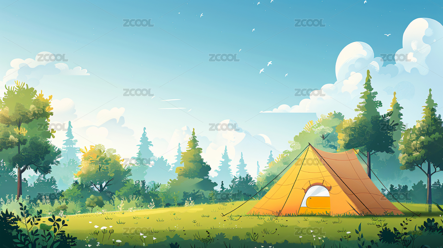 自然,风景,清新,插画,夏天,露营,春游,草地,帐篷,度假