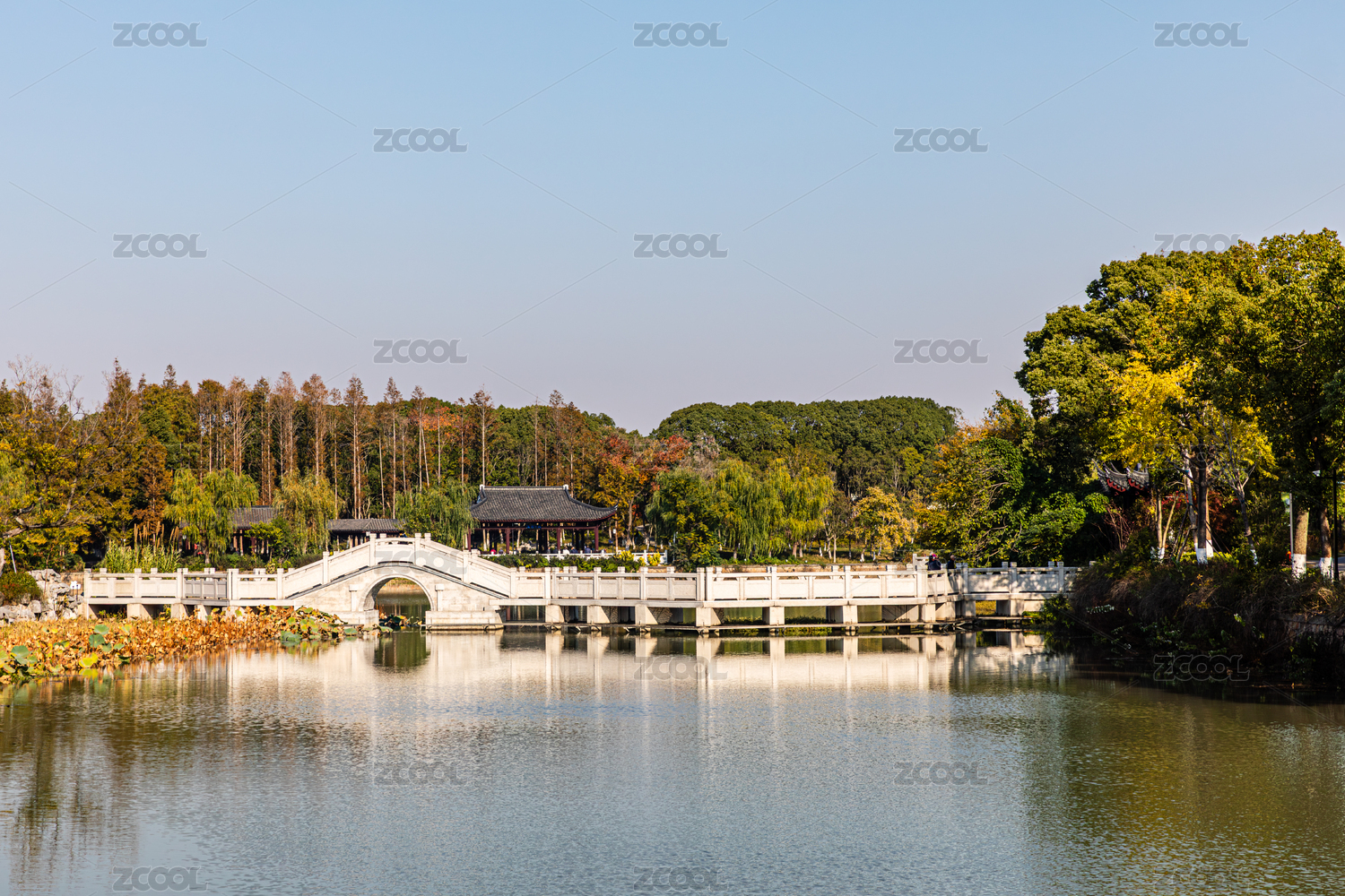中国浙江杭州西湖曲院风荷,中式建筑园林景观秋天