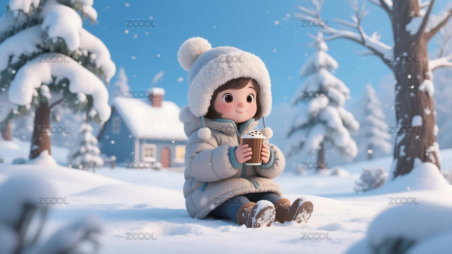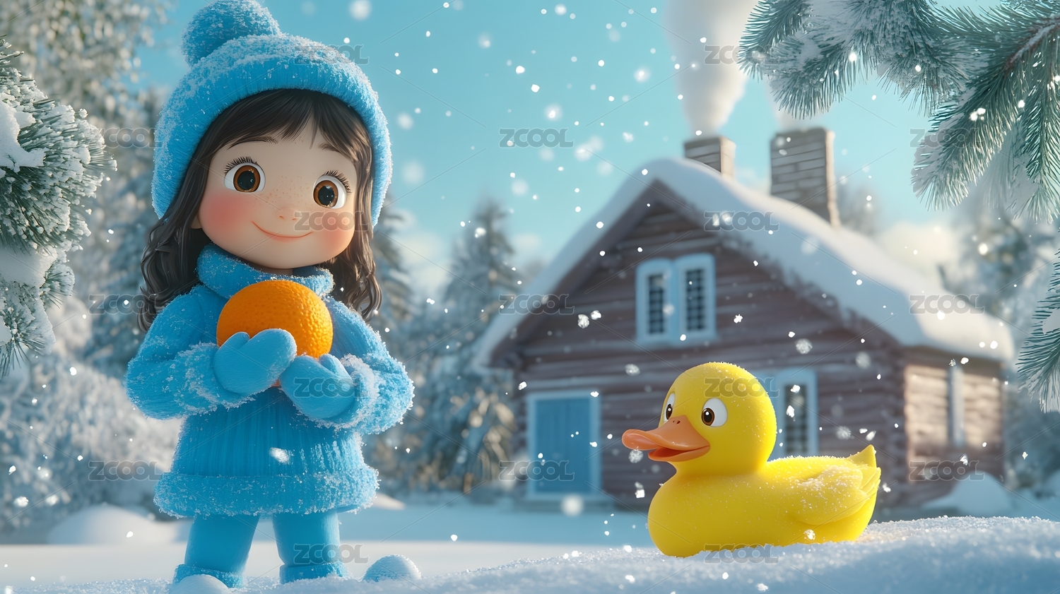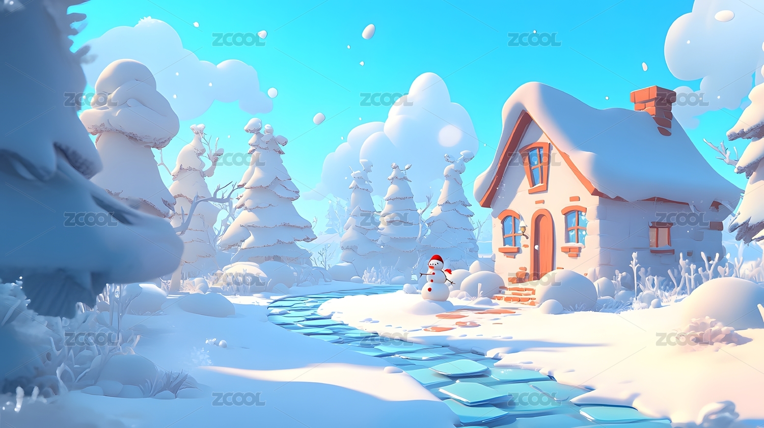 冬日雪景小屋与雪人温馨场景