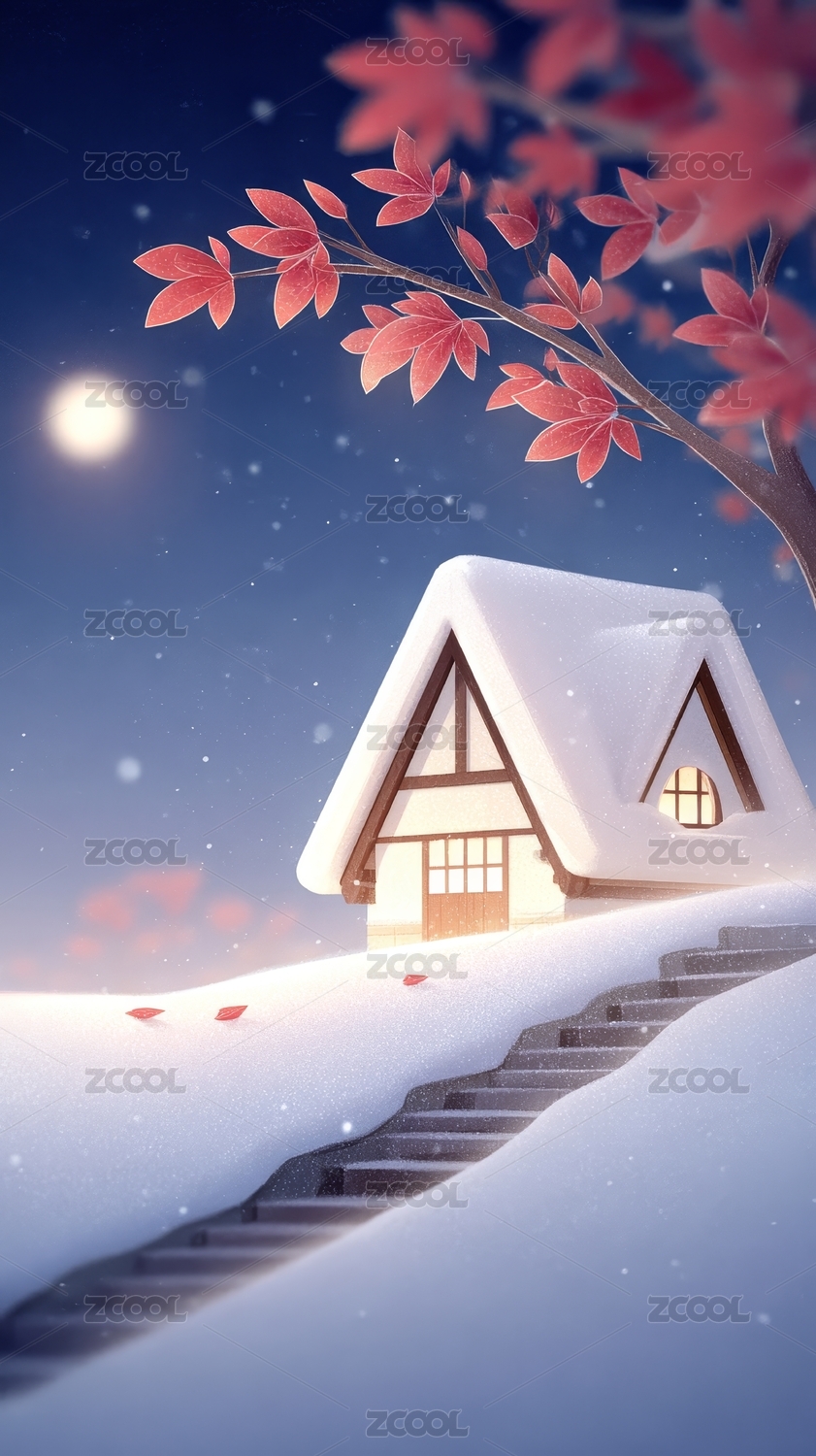 雪夜小屋红叶图