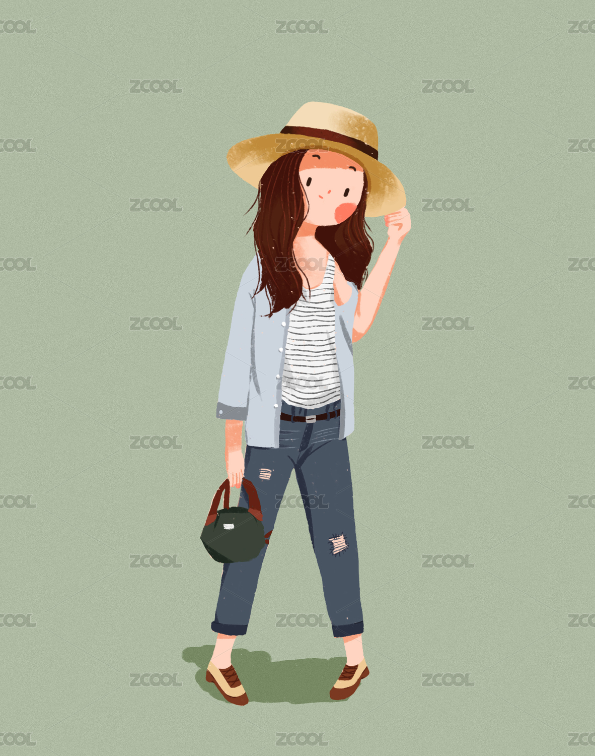 拿咖啡背斜挎包长卷发的时尚女孩插画