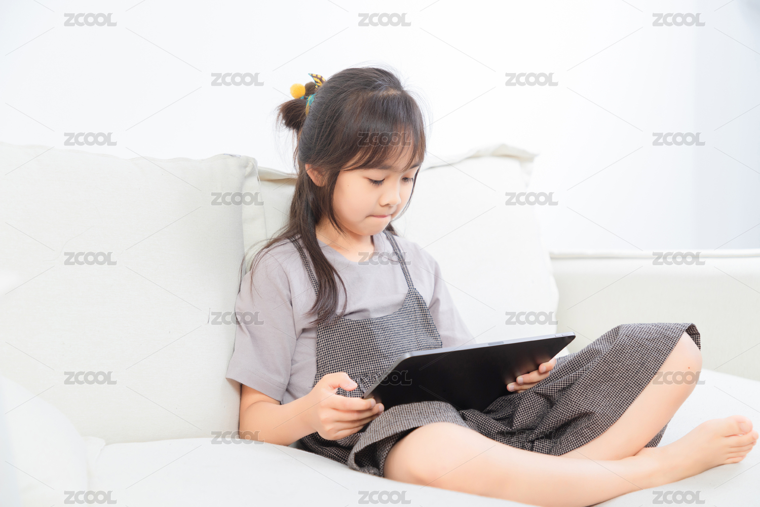 在沙发上玩平板电脑的的亚洲小女孩