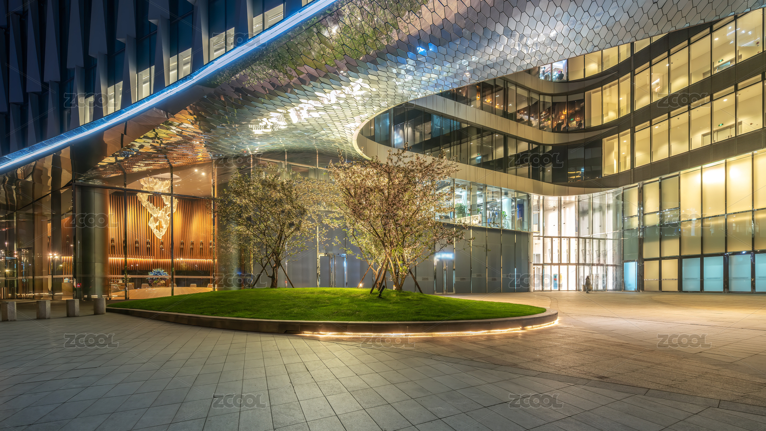 现代商业建筑,与在夜间空方/路面/空间的金融区。