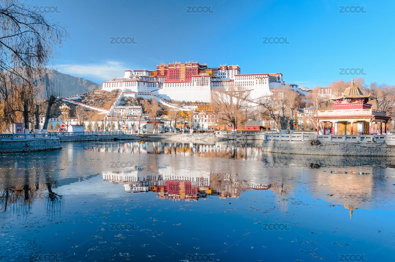 西藏拉萨布达拉宫古建筑与城市公园湖泊