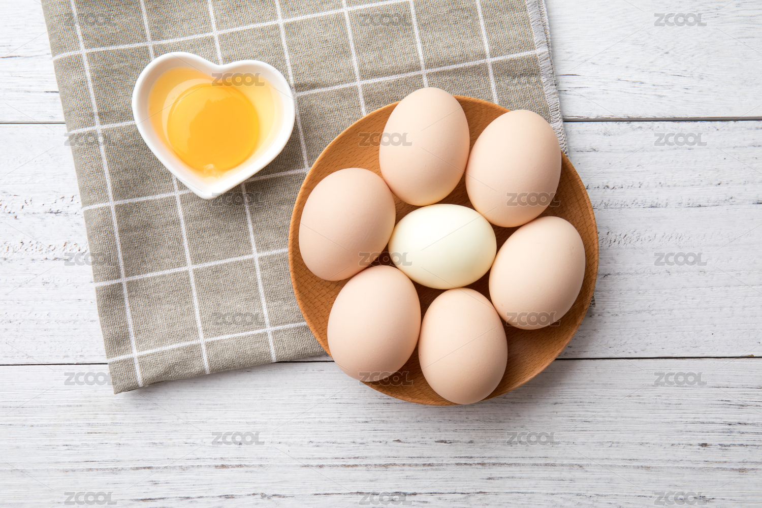 白色木纹背景中的一碟鸡蛋和蛋黄