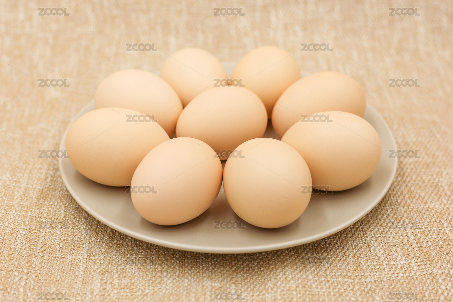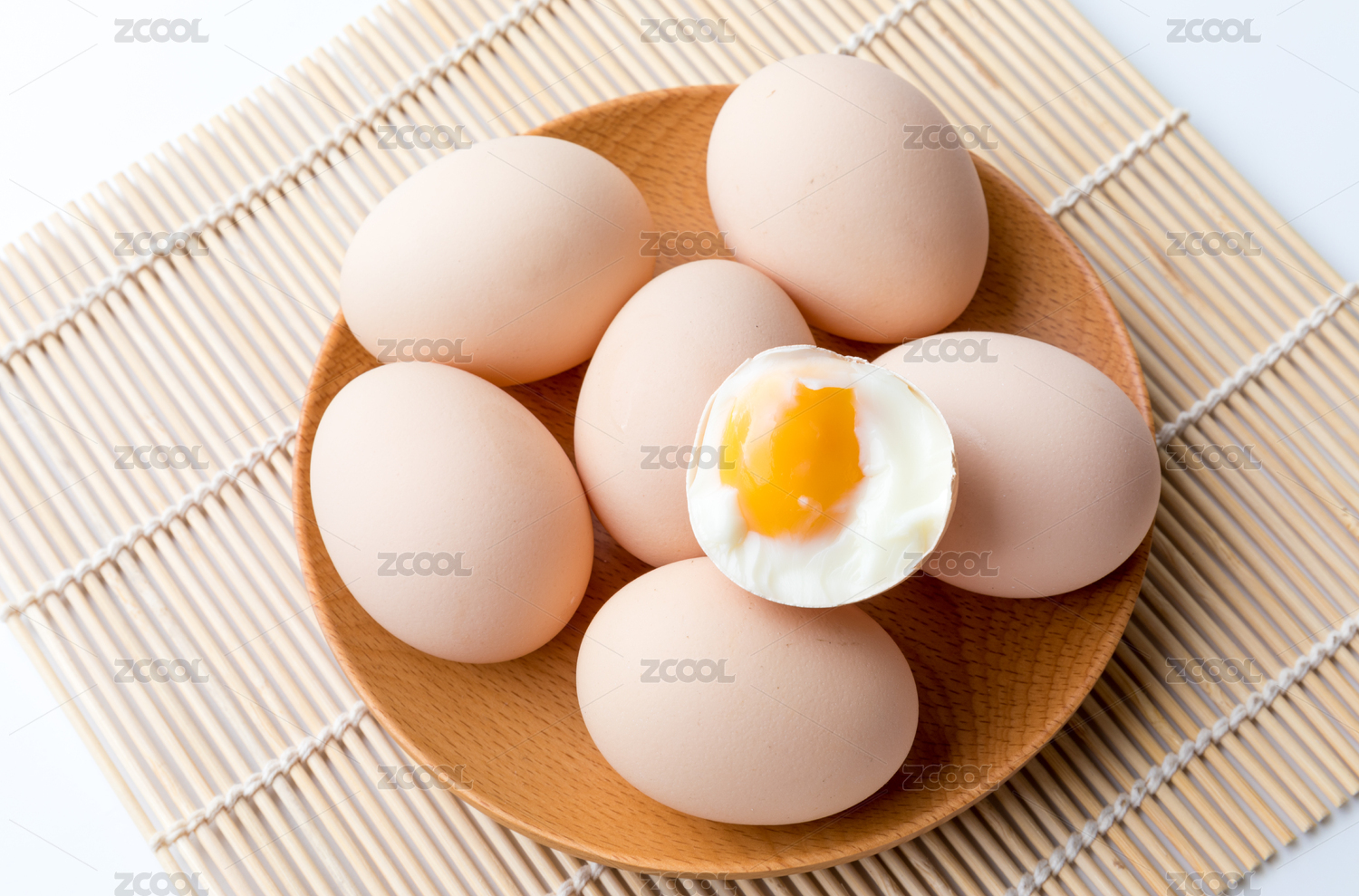 餐桌上的一碟鸡蛋和一个剥开的鸡蛋