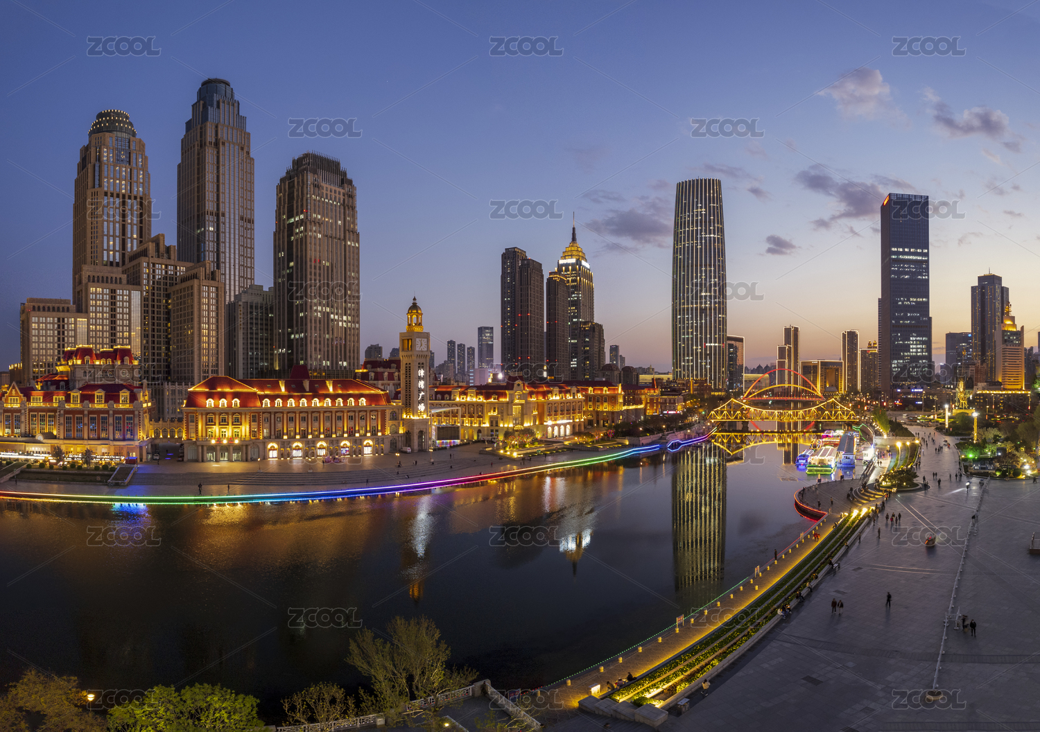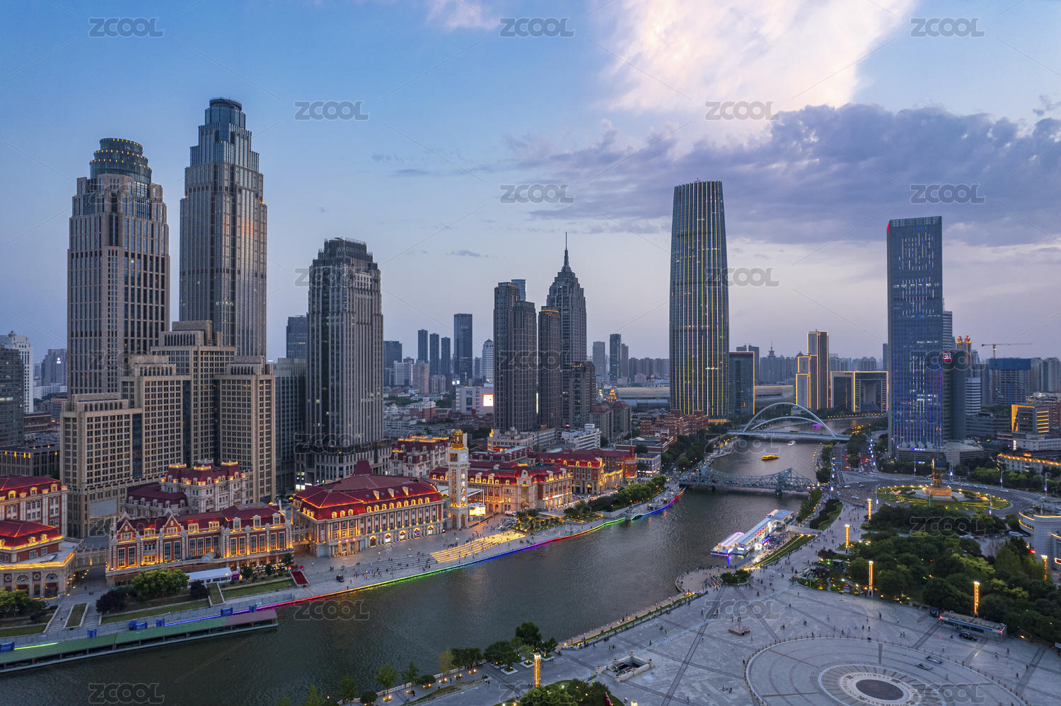 日落天津海河风景线小白楼商圈城市建筑夜景