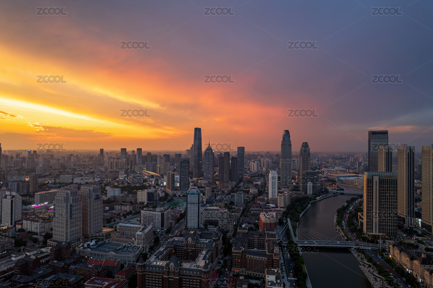 天津海河沿岸城市建筑日落晚霞航拍风光