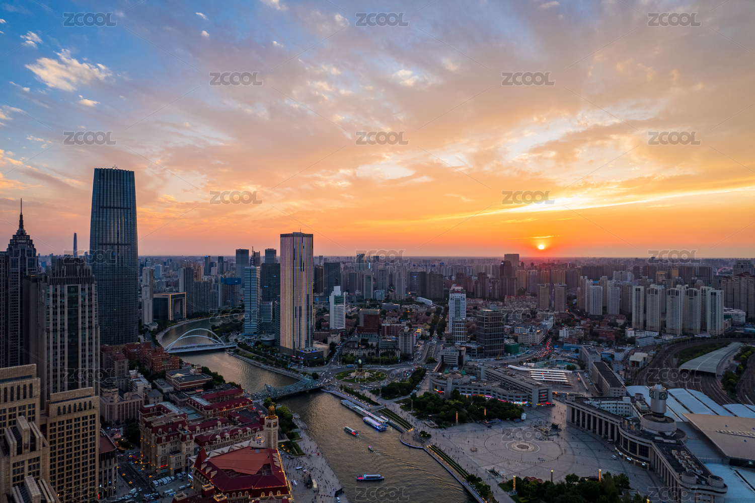 天津环球金融中心海河沿岸城市建筑日落晚霞