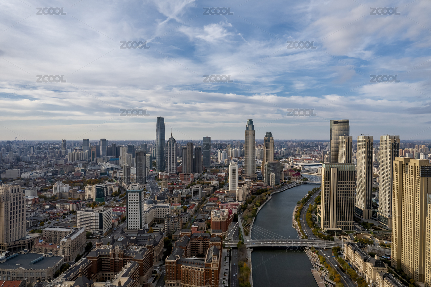 天津海河金汇桥小白楼商圈城市建筑日落风光