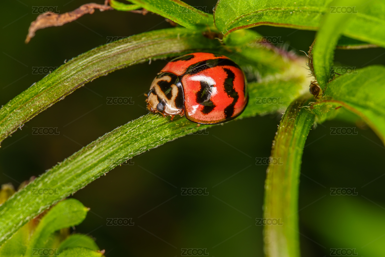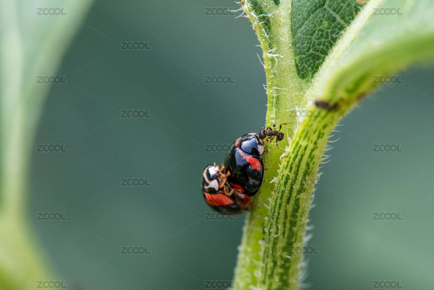 两只交配中的红黑色瓢虫和一只蚂蚁微距特写