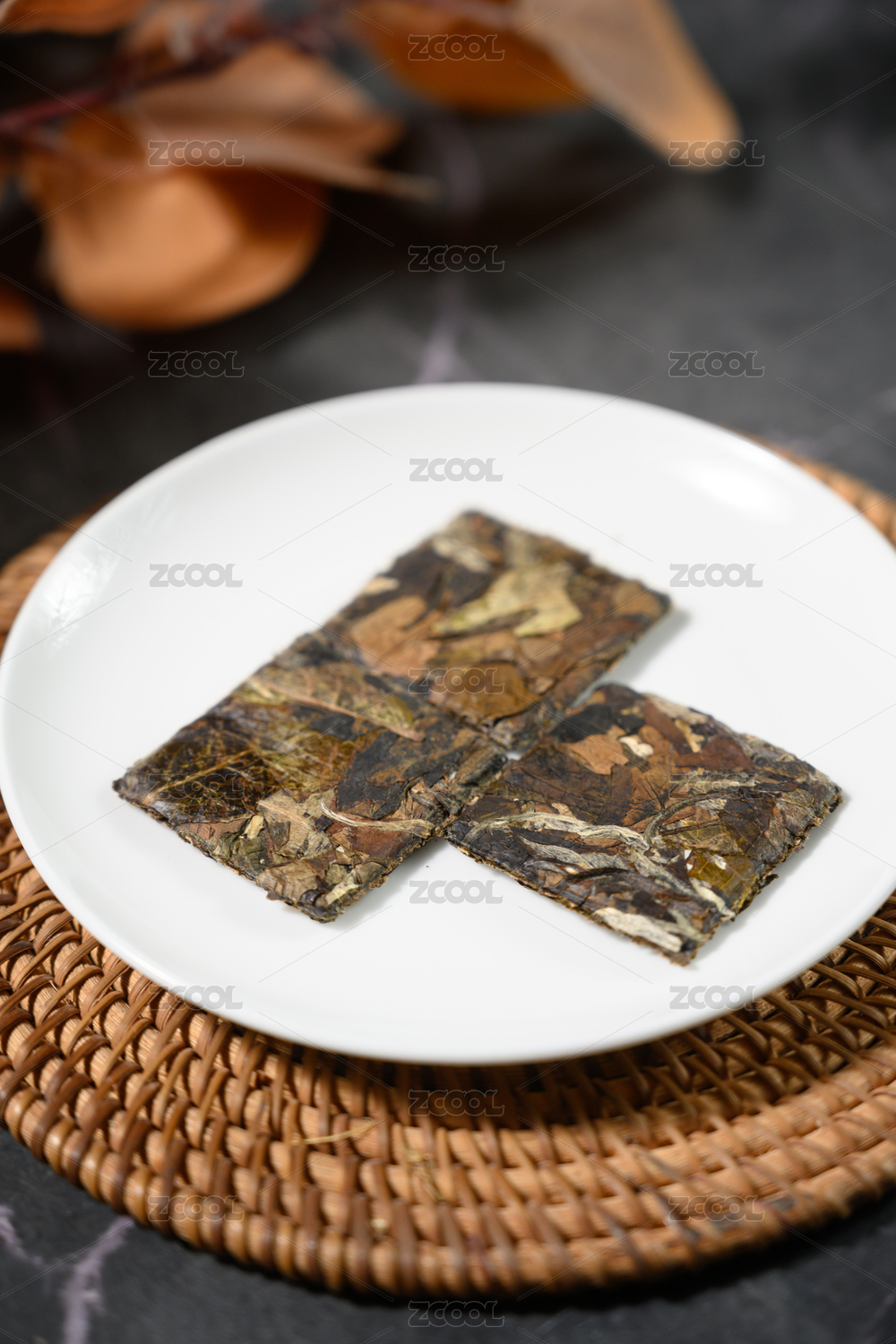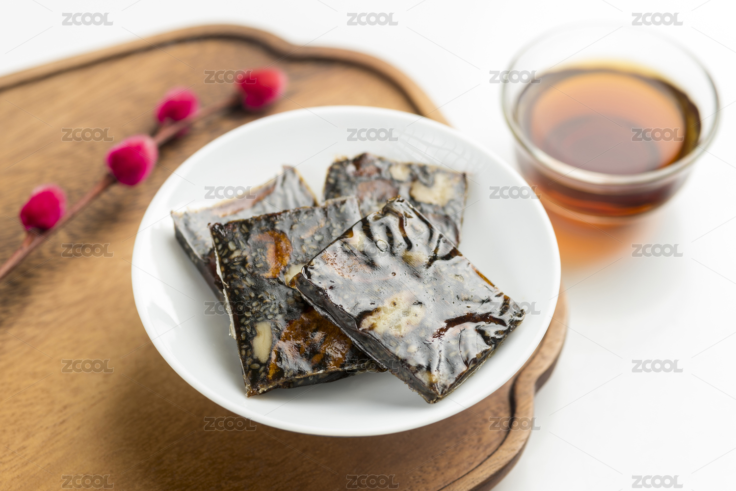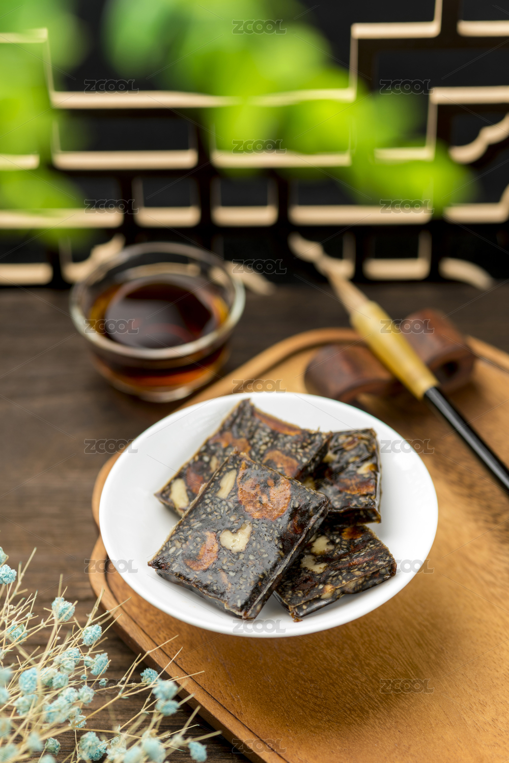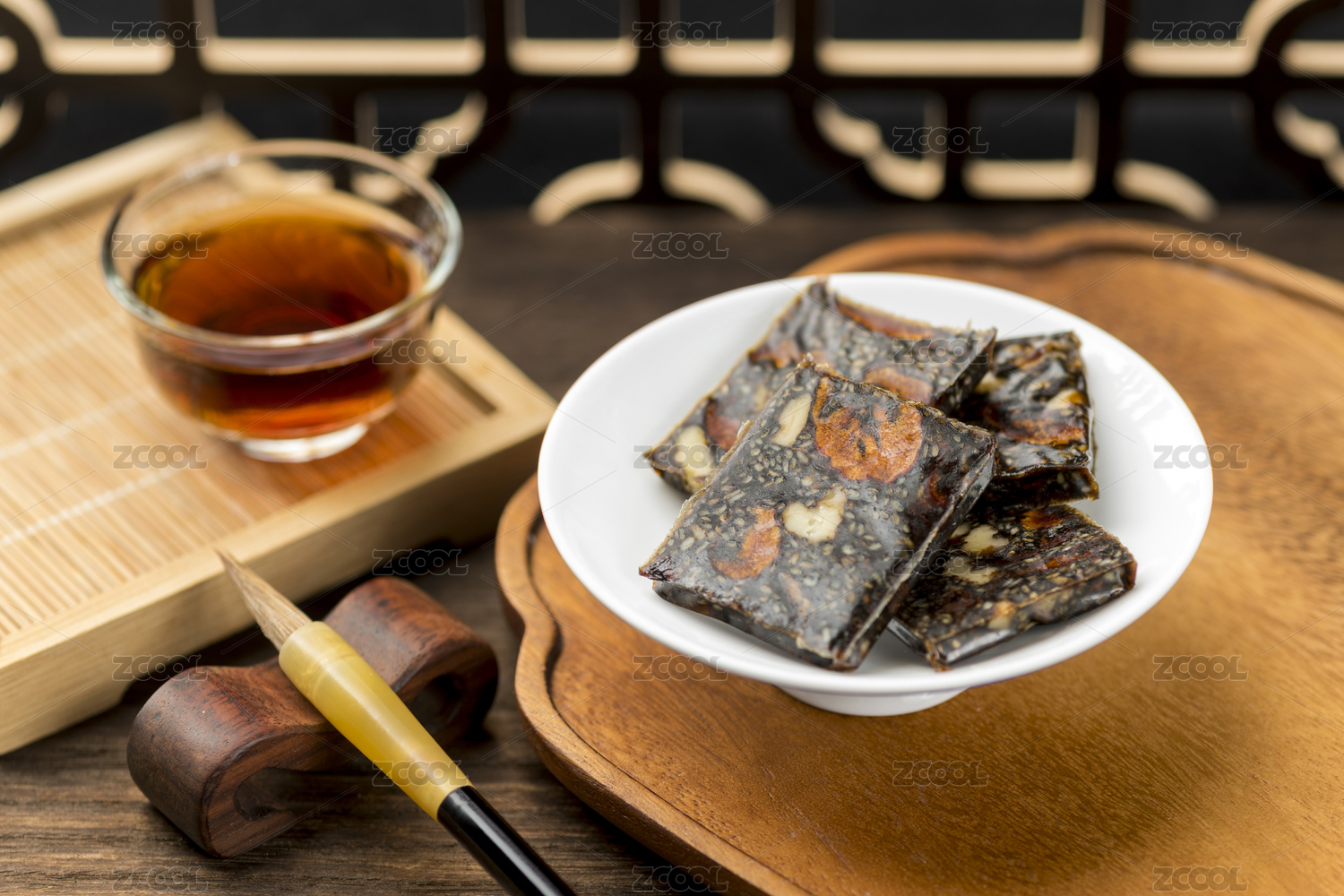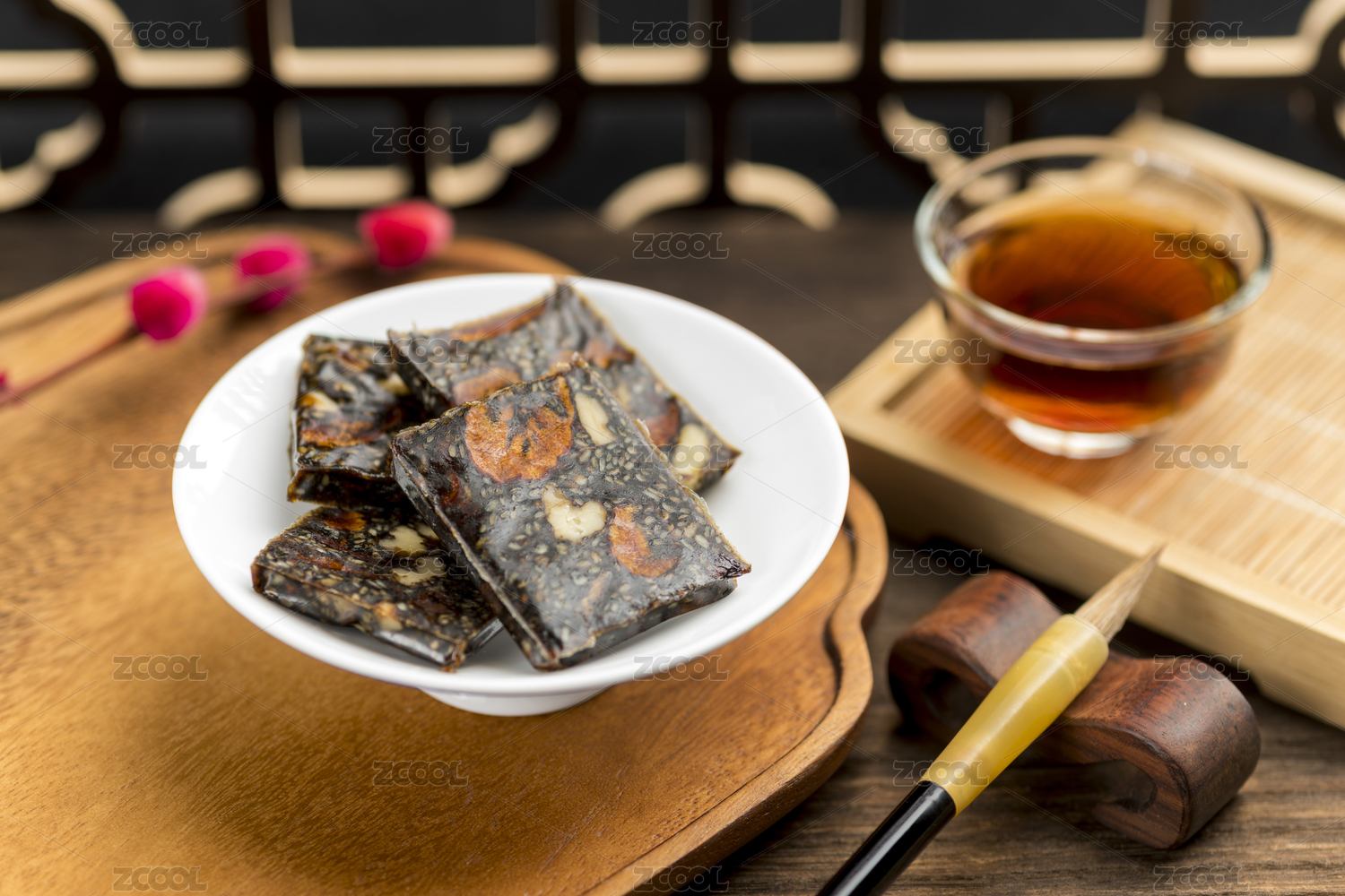 用木盘装着放在古书上传统点心黑芝麻糖俯拍