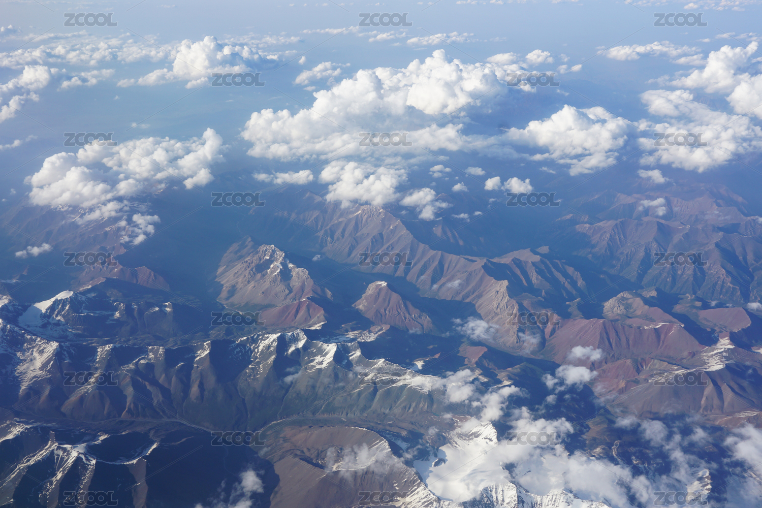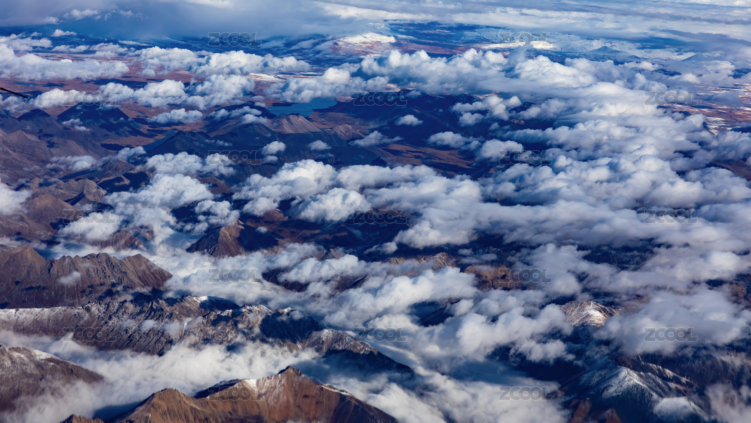 飞机窗外青藏高原连绵群山雪山云海风光