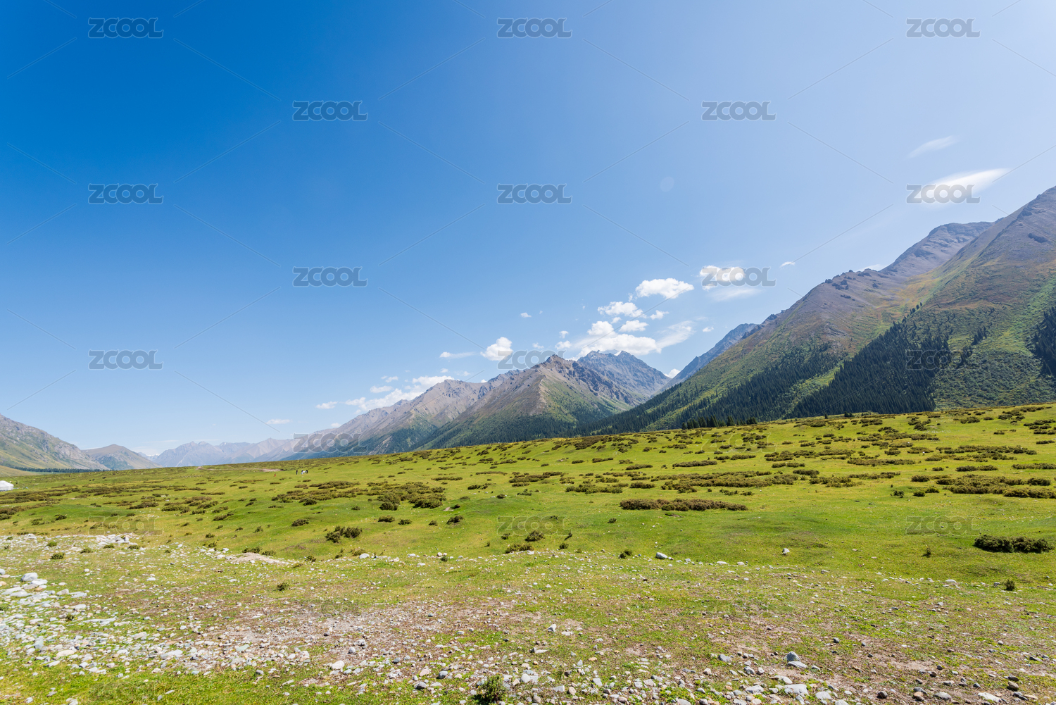 中国新疆夏季蓝天白云下G217独库公路沿途高山草原