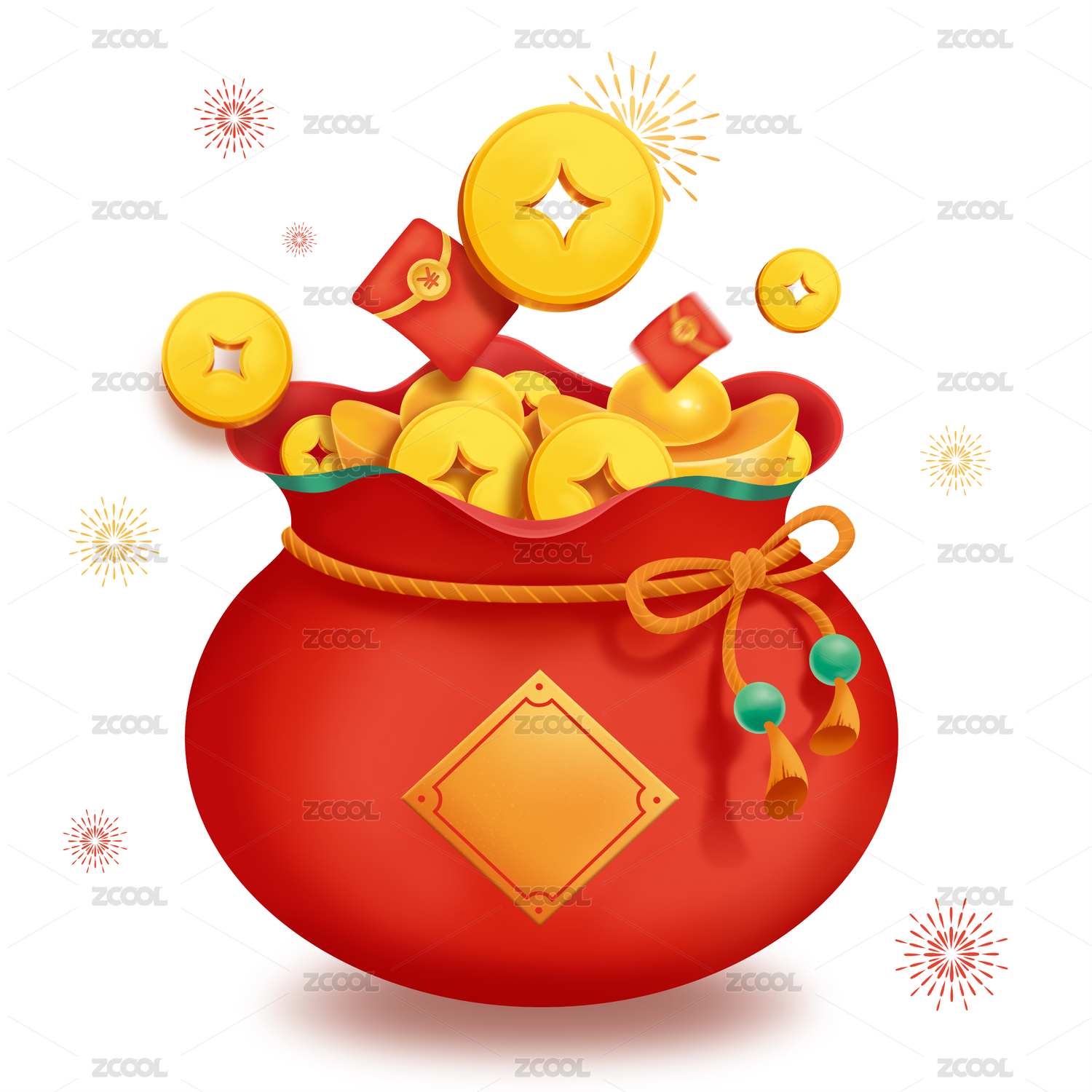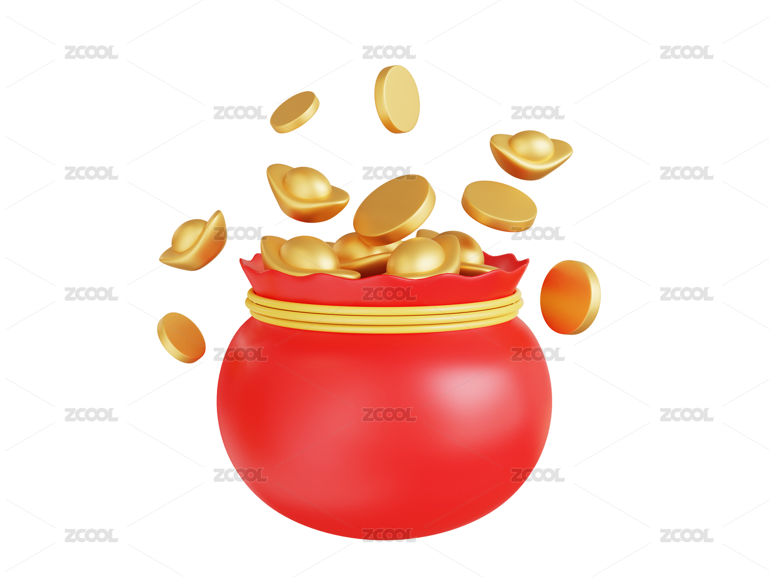 红金色装满元宝硬币的钱袋新年喜庆3d插画