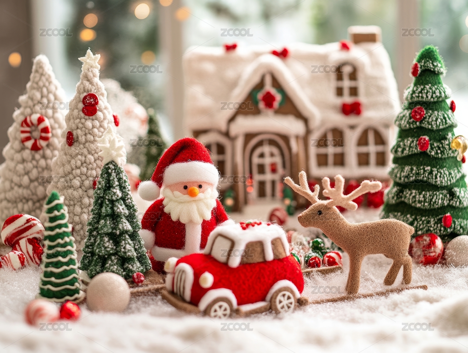 圣诞场景:雪地中的小屋、汽车与圣诞老人