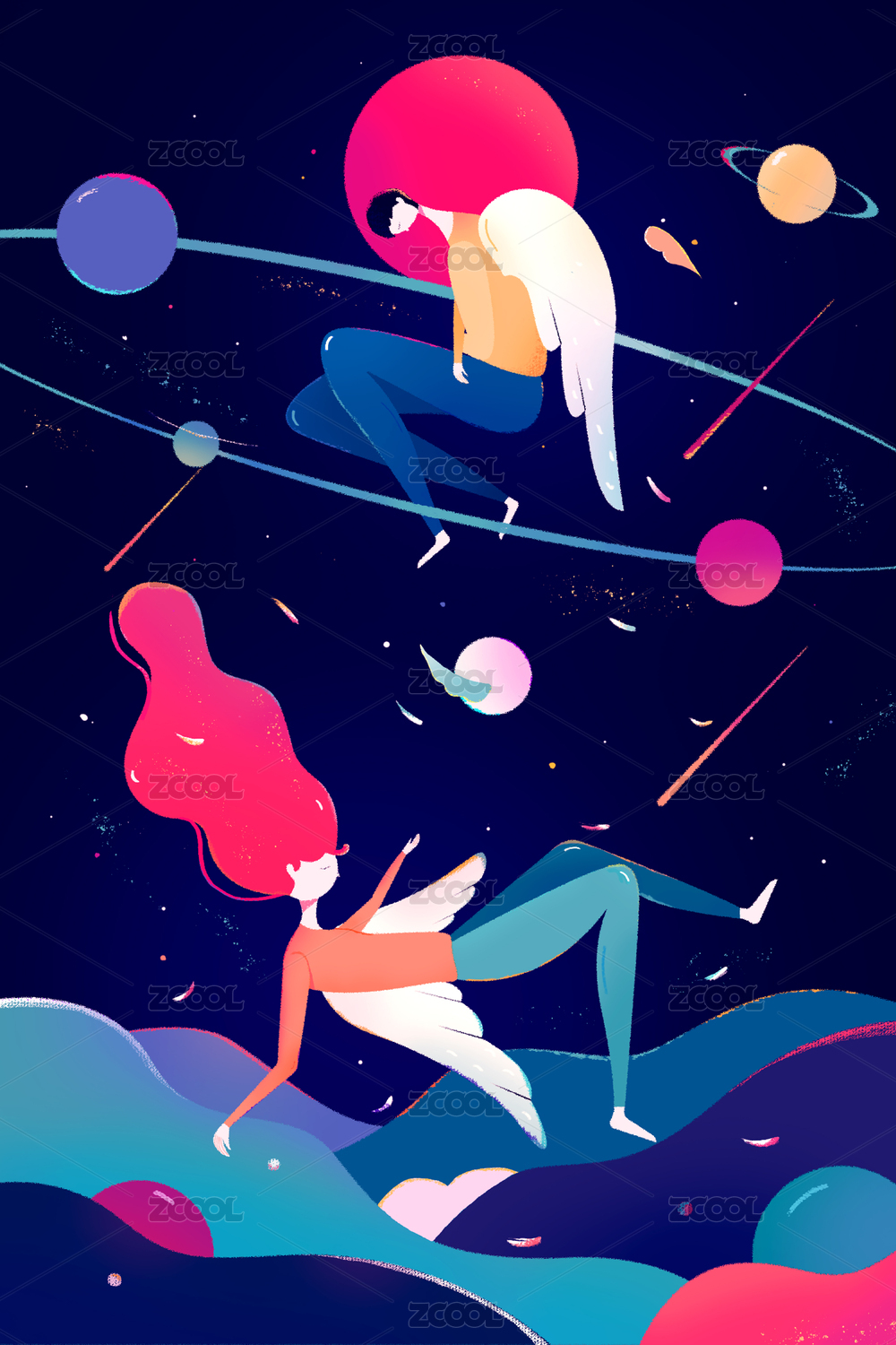 星空卡通人物流体渐变插画