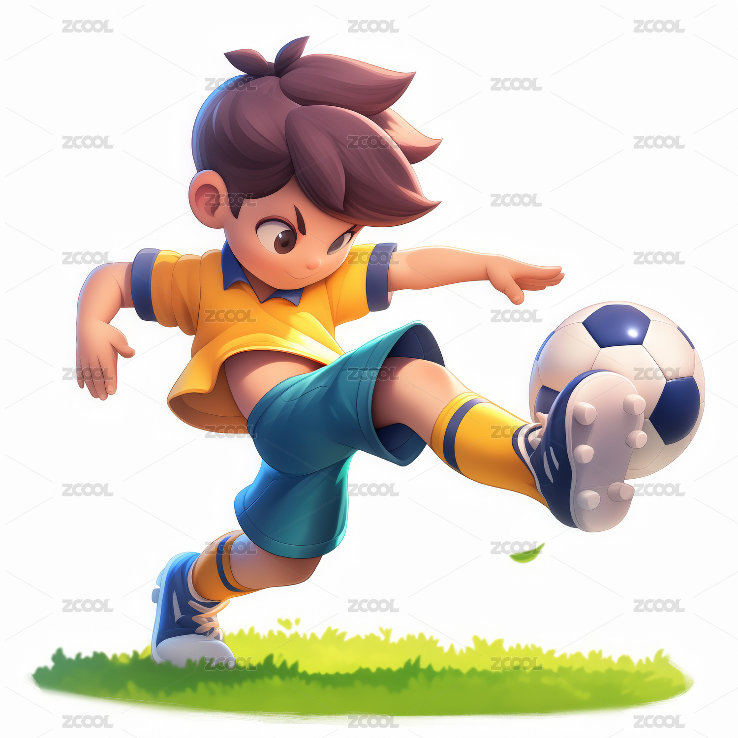 3D卡通风格,一个可爱的男生在草坪上踢足
