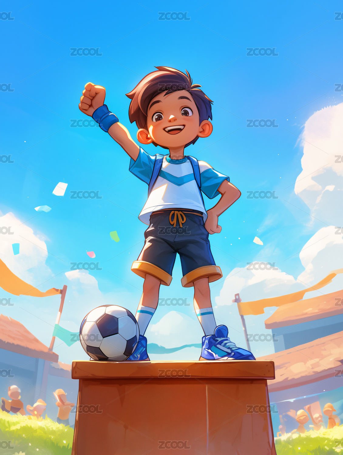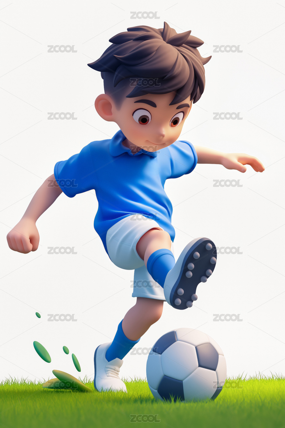 穿蓝色球服的男孩和足球3D卡通插画素材