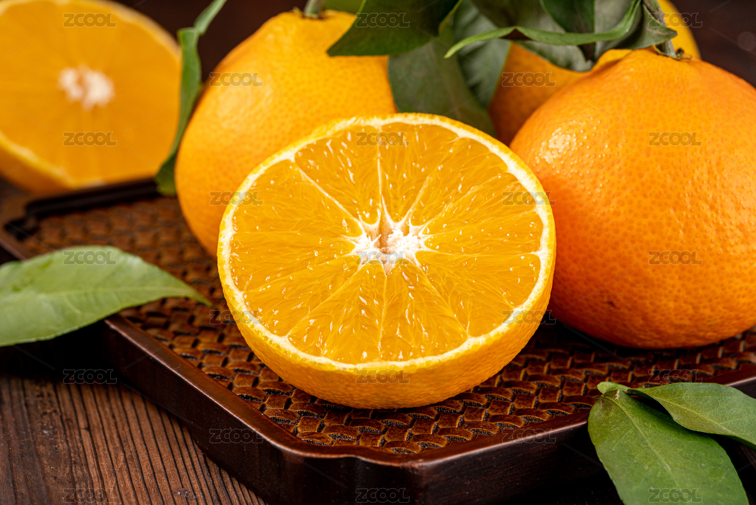 两个完整的和切成一半的脐橙一起放着竹垫上