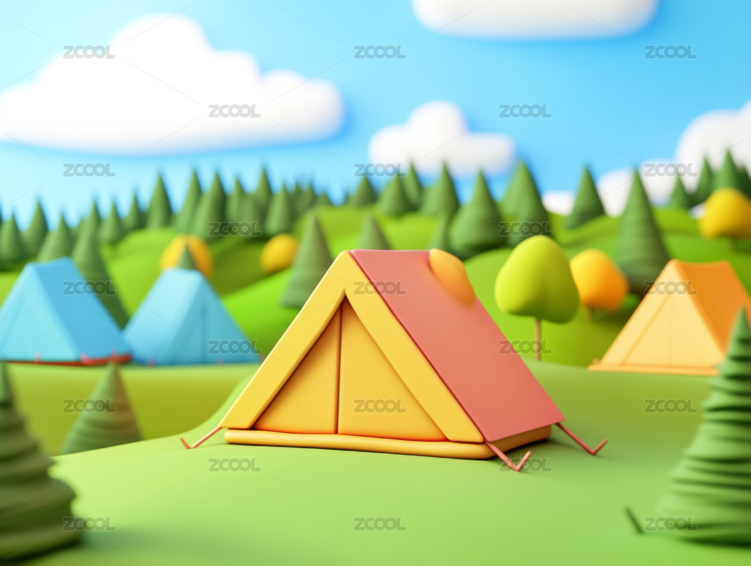 卡通3D草地上的帐篷插画