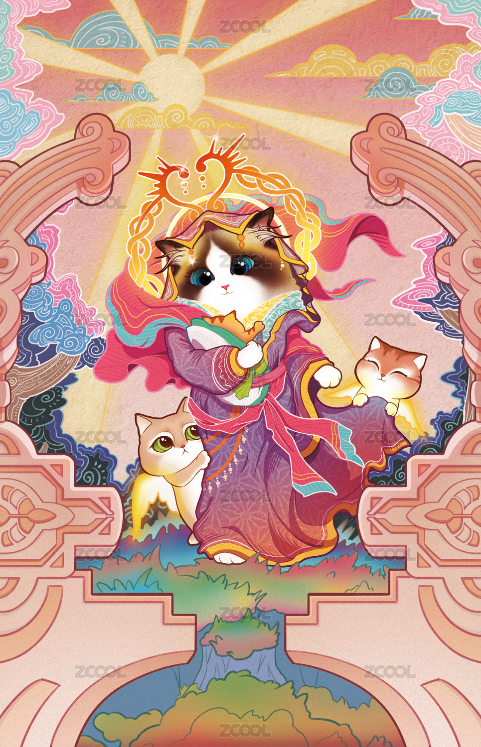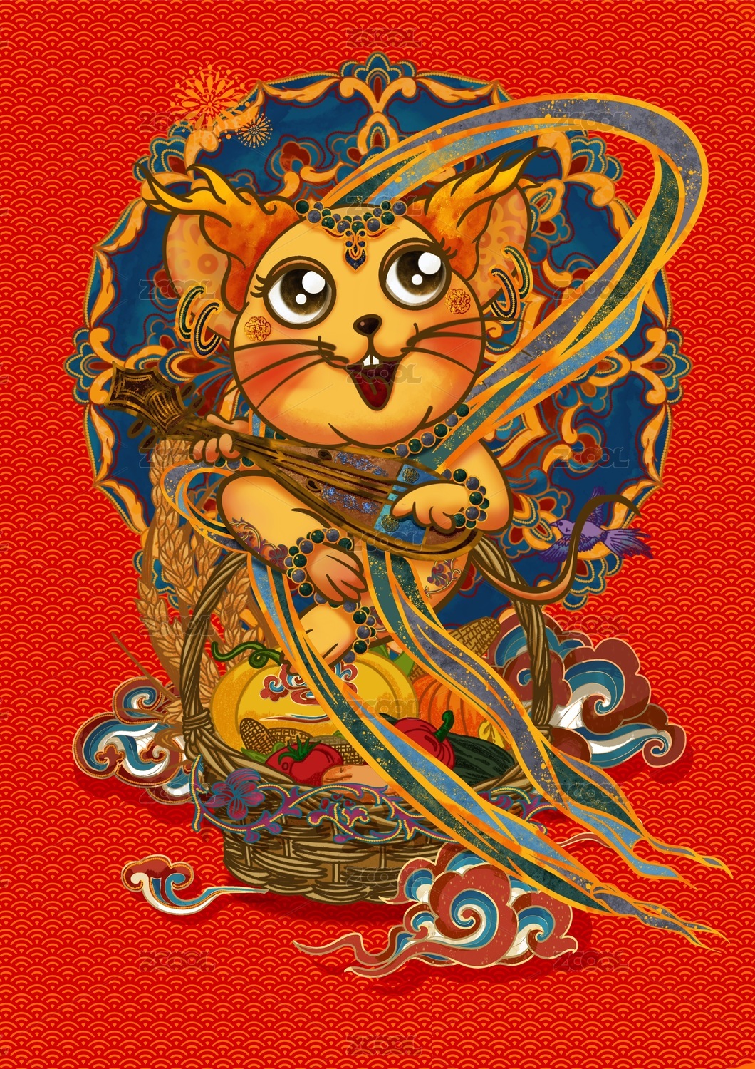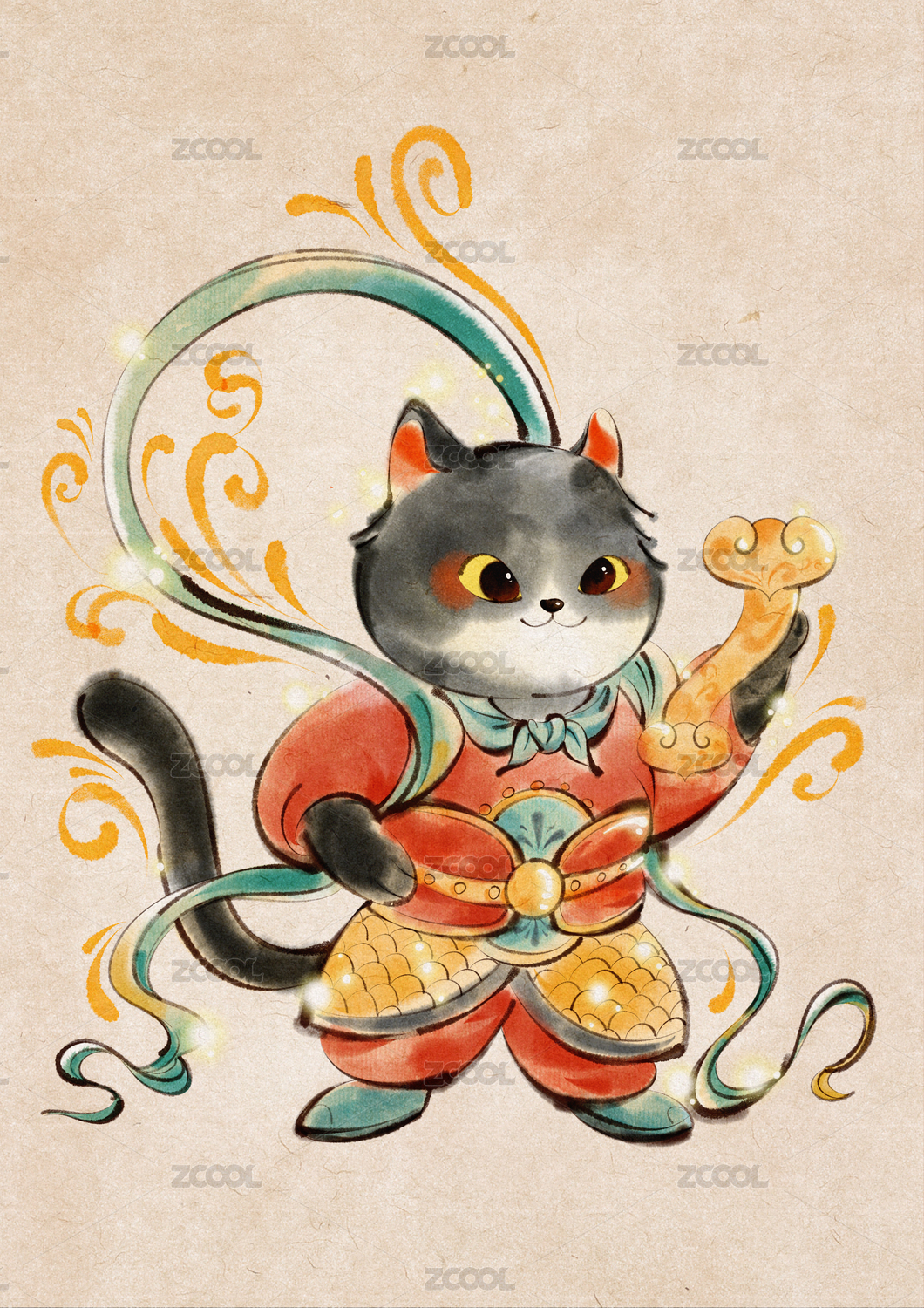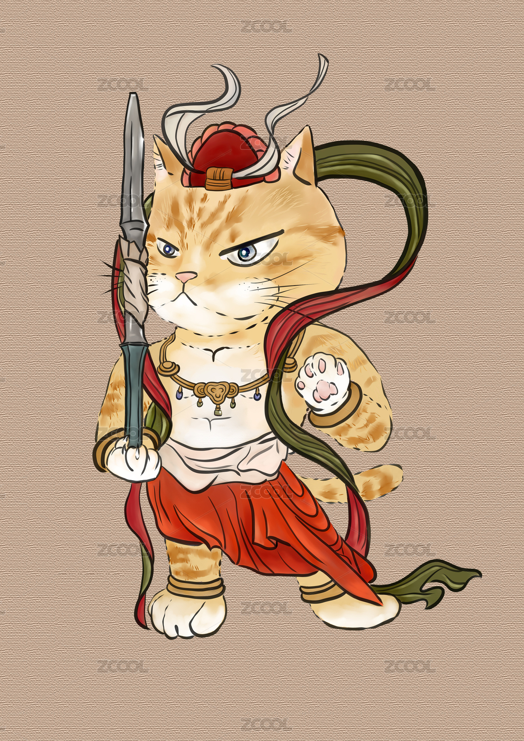 中国风,国潮,门神,年画,古风,小动物,猫,武将,白猫,HEBTHXC