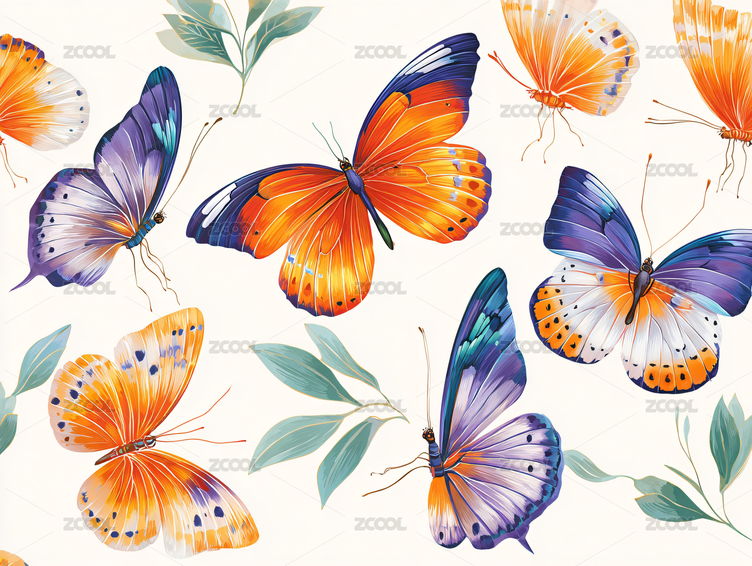 橙黑花纹蝴蝶伴花叶图案