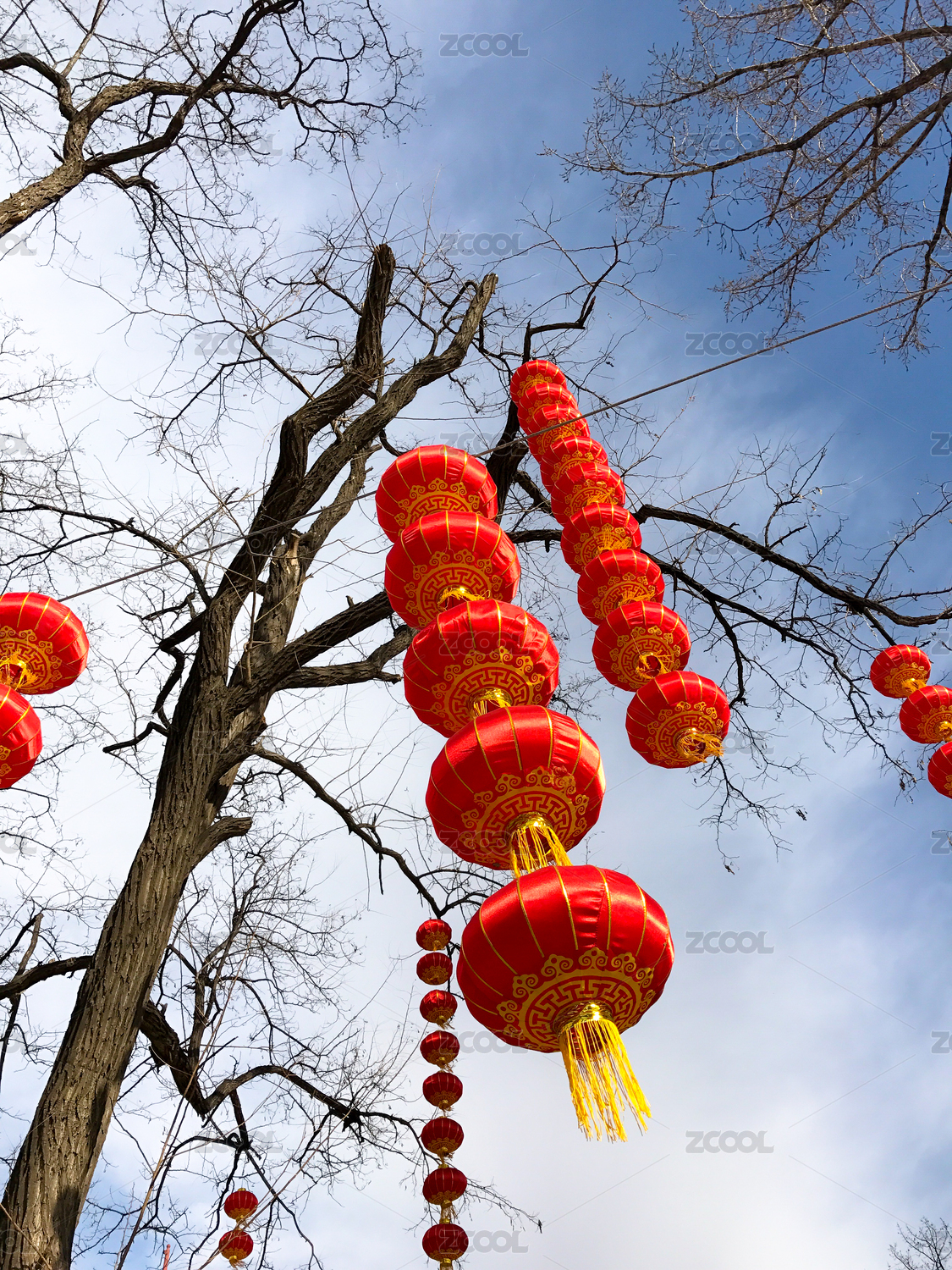 蓝天白云下的树丫挂着红灯笼
