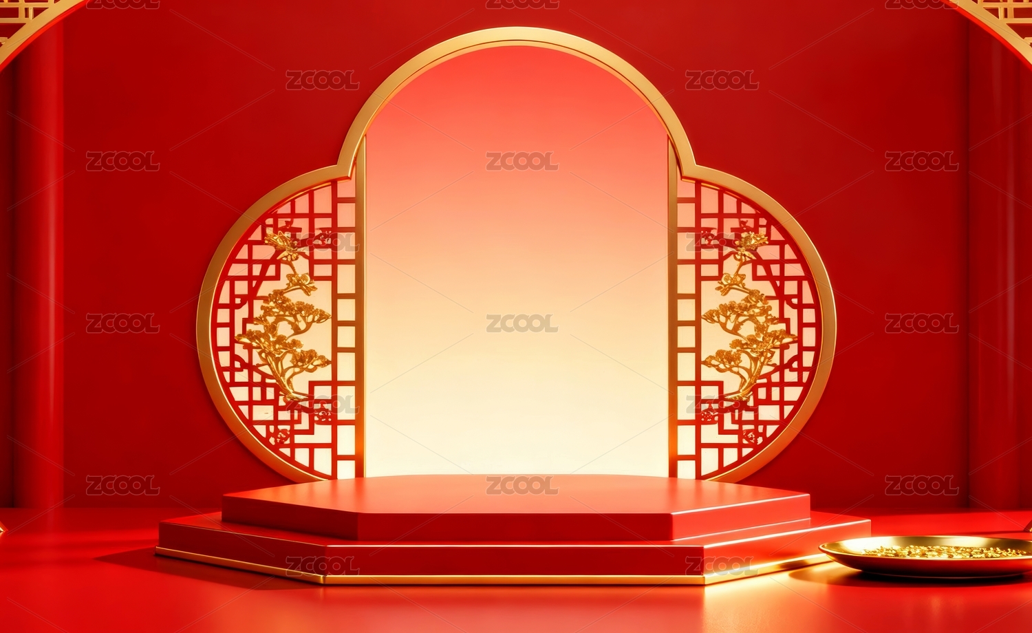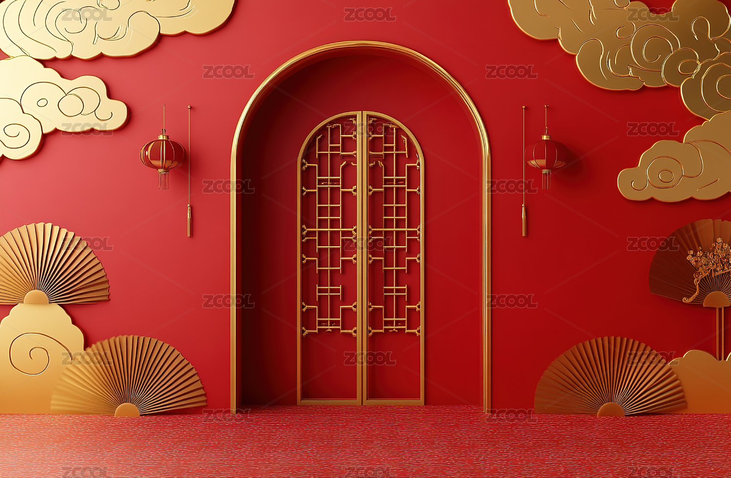 新春传统中式金色屋顶的圆形红柱庭院拱门