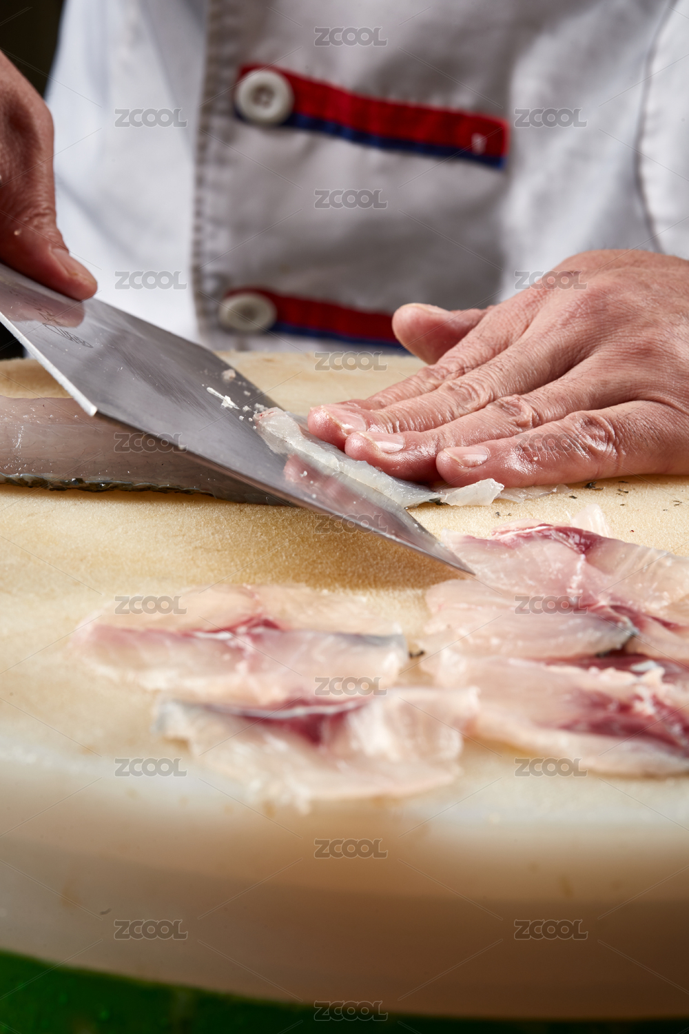 白色砧板上厨师用精湛的刀工展示鱼脍