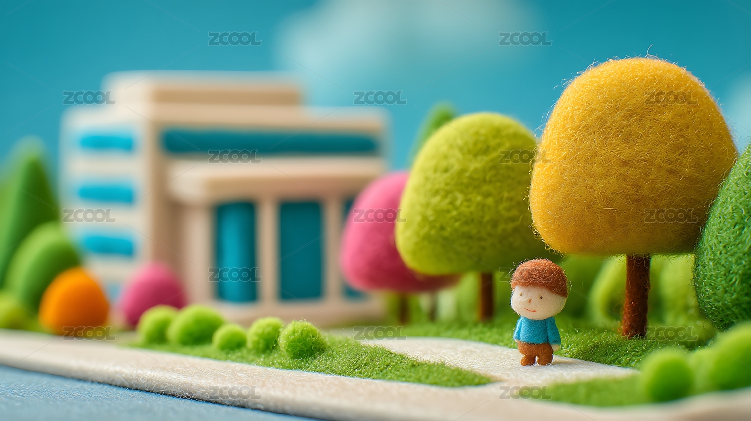 微缩创意晴朗的天气里小丑在草坪中奔跑