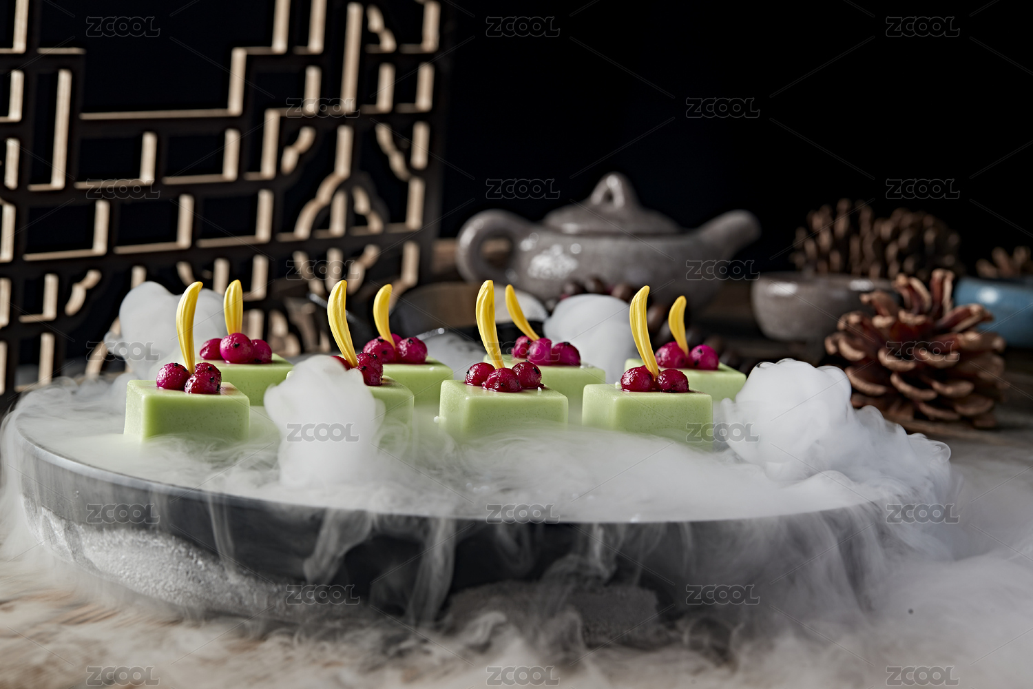 干冰缭绕的黑瓷餐具摆放的番茄糖霜江米糕