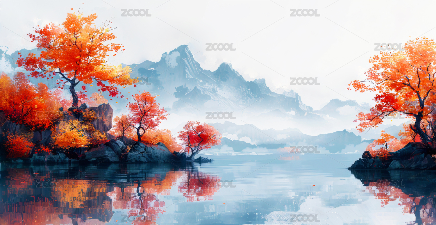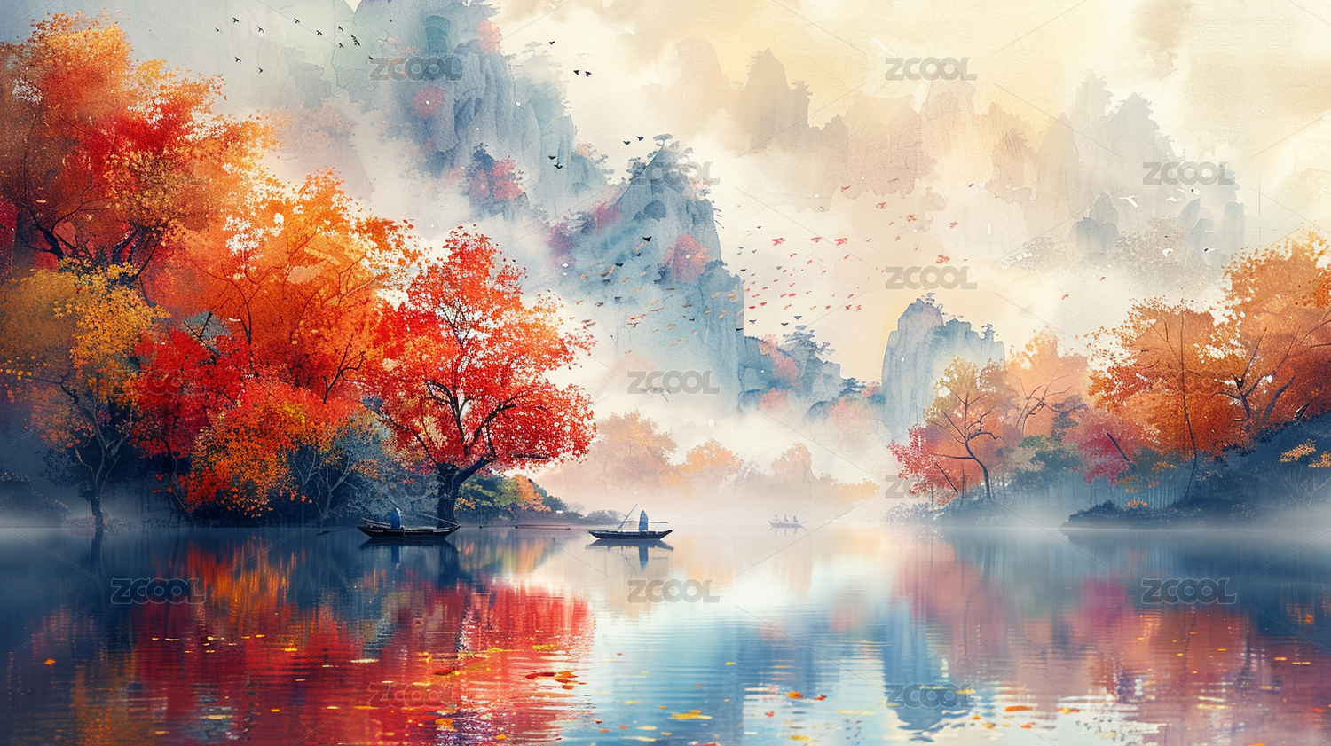 秋天,国风,山,水,自然,风景,插画,背景,瀑布,红叶