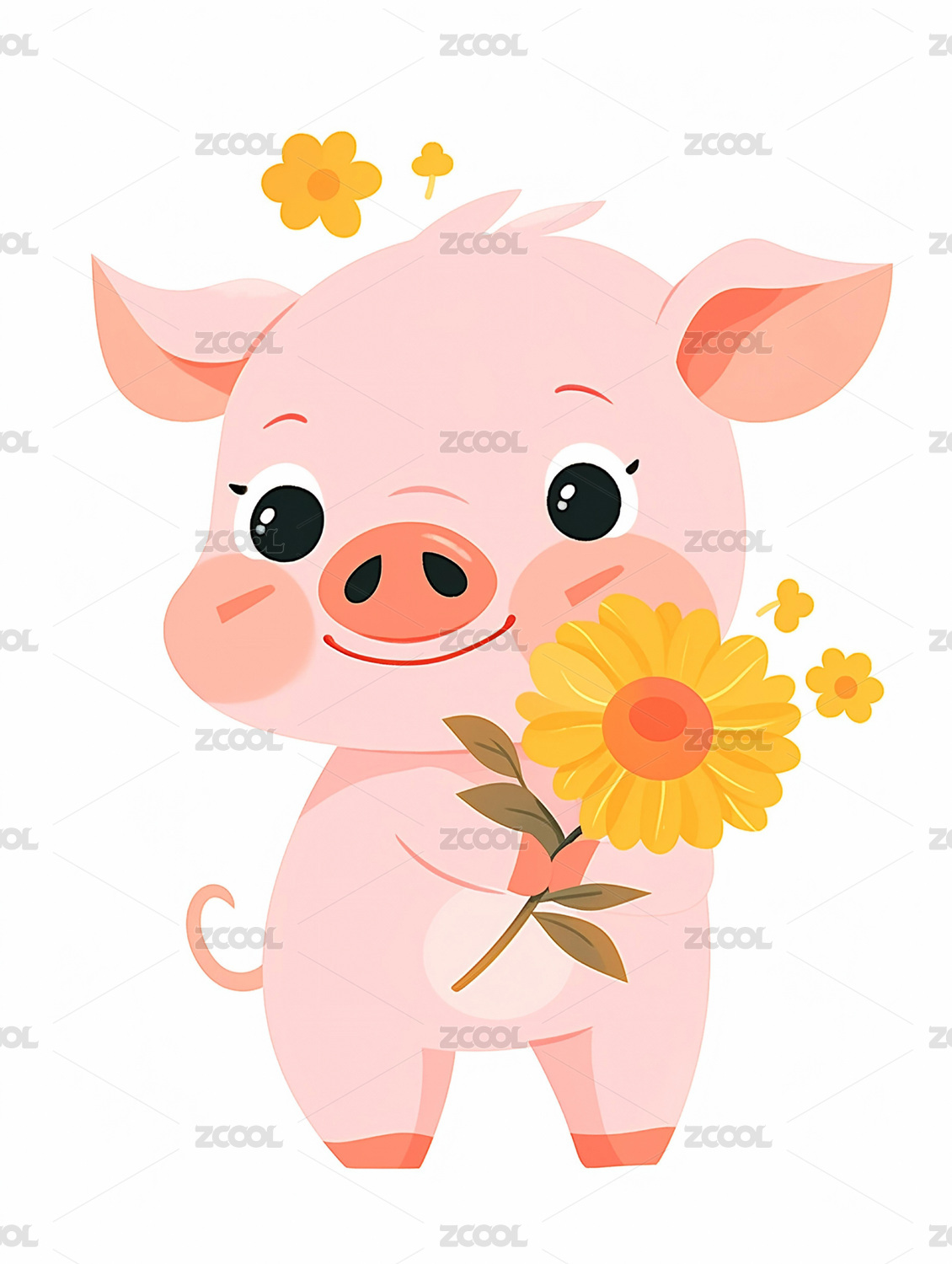 白天晴朗树丛草地的猪肥猪特写插画绘画手绘