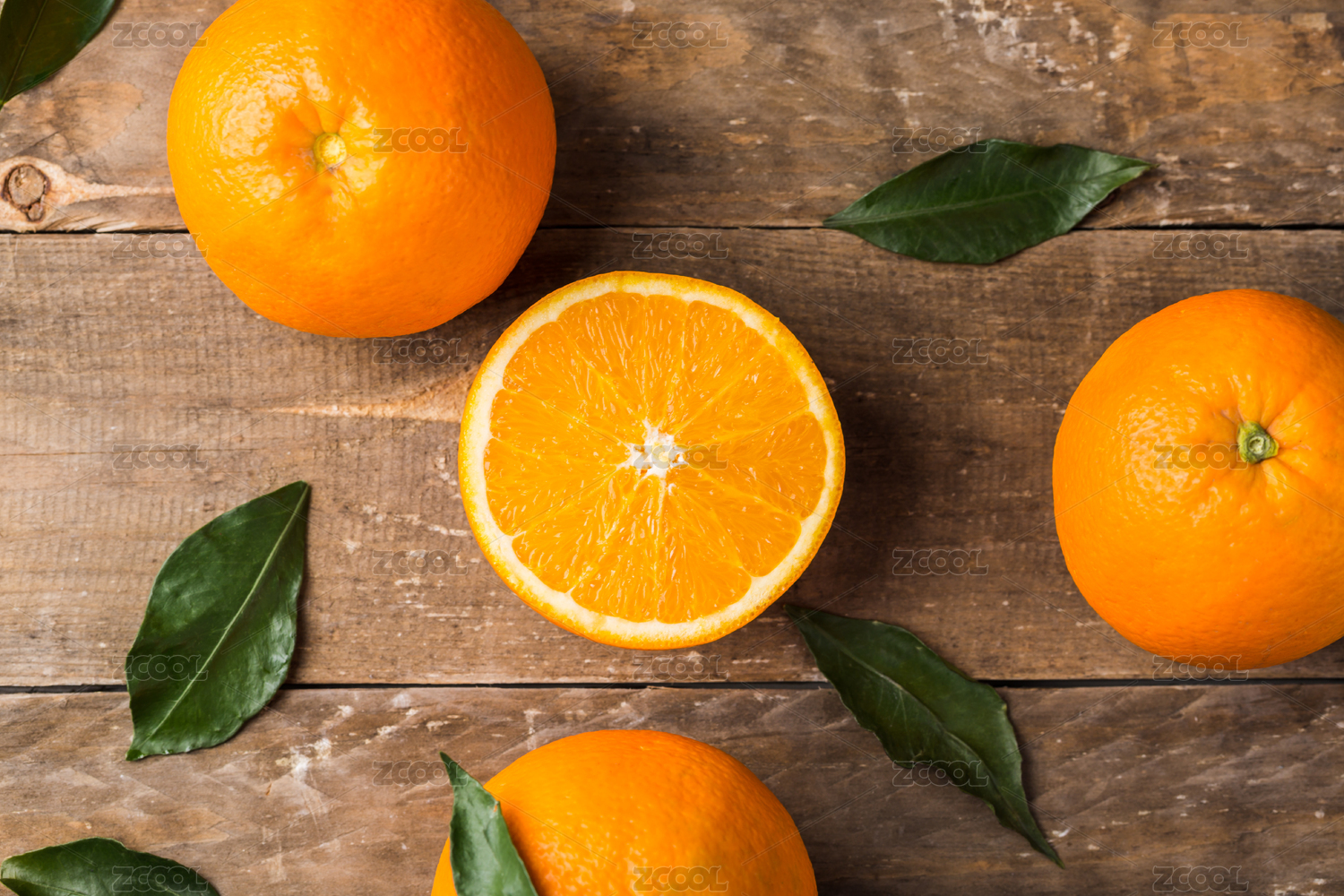 新鲜的橙子和切开的橙子,以及绿色的叶子在木板背景上
