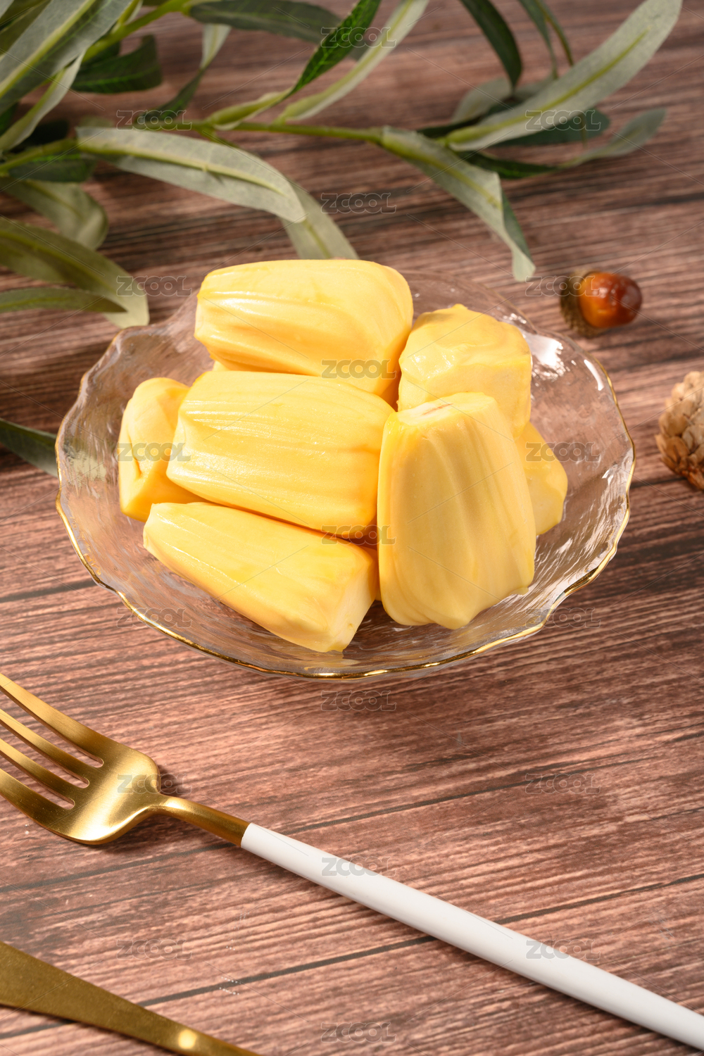桌面上的玻璃盘子里的美味可口的菠萝蜜